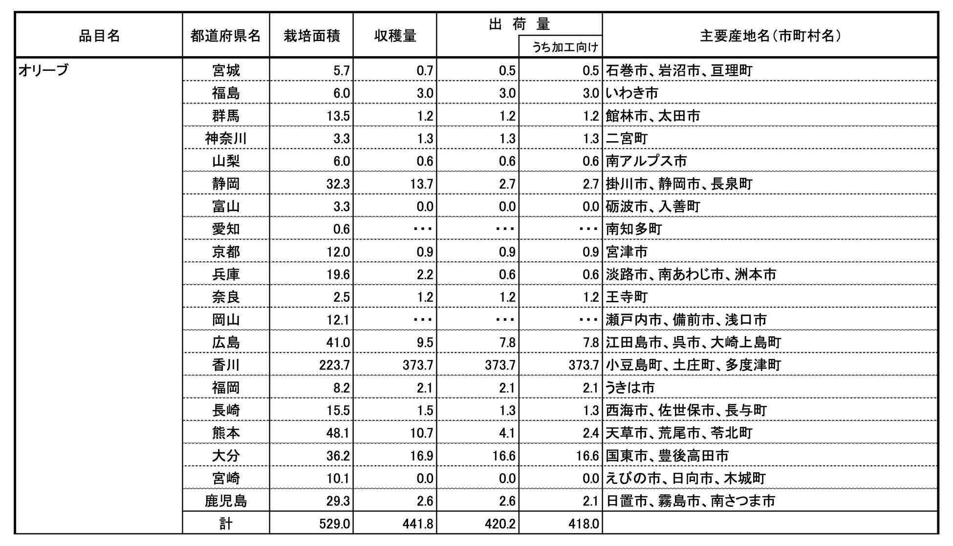 【参考情報】都道府県別オリーブ収穫量、栽培面積