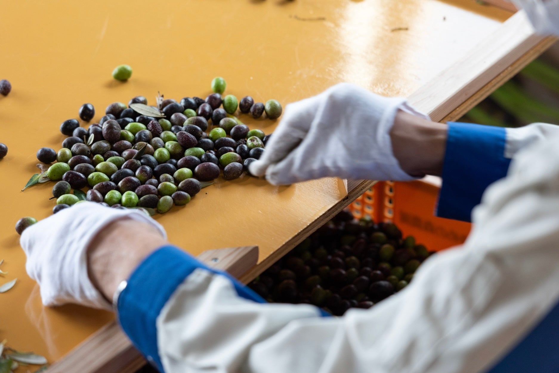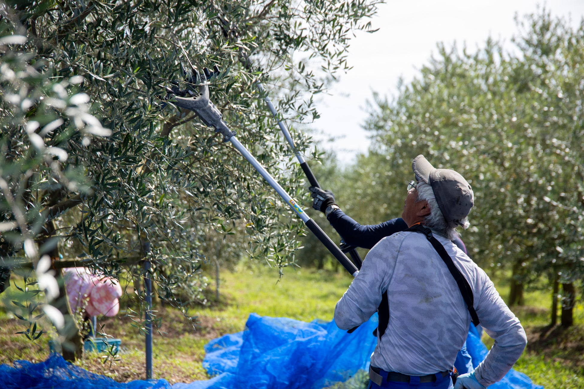 ・オリーブオイルは「鮮度が命」。収穫シーズン中は、農園スタッフや地元の収穫アルバイトの方々が朝6時から作業を開始します。オリーブの実はひと粒ひと粒、丁寧に手摘み。2024年シーズンから電動収穫機を全国の産地に先駆けて導入し、省力化を推進するとともに、品質向上との両立を図っています。
