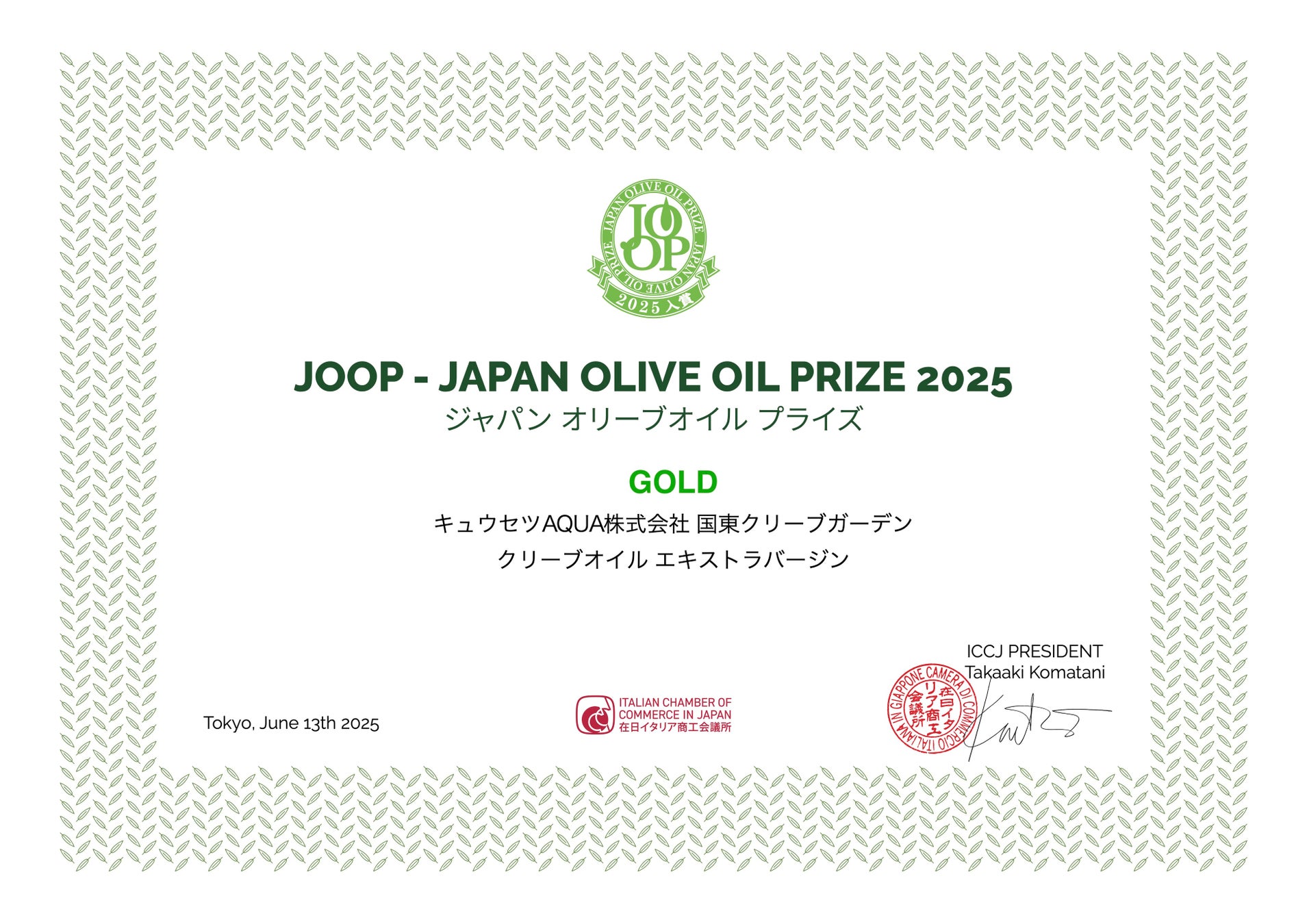 キュウセツ AQUA 株式会社 国東クリーブガーデン(オリーブ事業推進室⻑ ⼤野貴博)は、各国を代表する最高峰のエキストラバージンオイルを選定する「Japan Olive Oil Prize(日本オリーブオイル大賞:略称JOOP)2025」(主催:在日イタリア商工会議所)に、大分県国東産エキストラバージンオリーブオイル「クリーブオイルエキストラバージン」を出品。金賞という高評価を得ました。※6/18(水)全結果発表