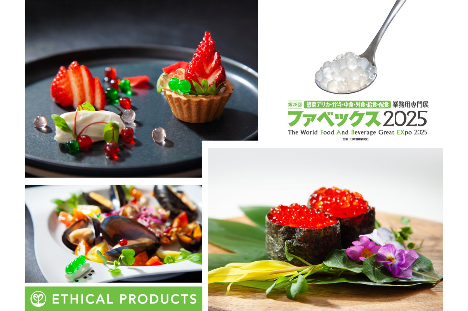 エシカルプロダクツ株式会社(所在地:熊本県水俣市/ 代表取締役:永井香織)は、4月15日(火)〜17日(木)の3日間、東京ビッグサイトで開催される「ファベックス 2025」に出展いたします。当社ブース(東1・2ホールF-Q47)では、代表者の永井が発明した浸透圧による液体成分変換技術を活用した創作料理向け粒状食品「プチル」や、コレステロール・プリン体ゼロで食事に制約のある方もおいしく召し上がれるプラントベースフード「植物生まれのイクラちゃん」を展示いたします。