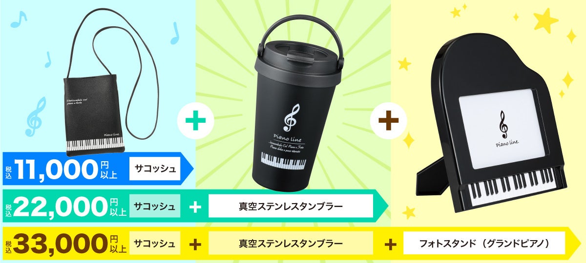 ピアノ・音楽デザインの各種雑貨類を販売する、インターネット通販サイト「ピアノライン 公式オンラインショップ」にて、お得なトリプルプレゼントキャンペーンを行います。