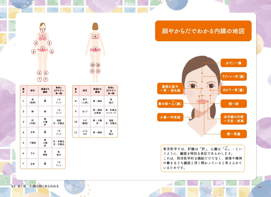 本書では、東洋医学の知恵、とくに「望診(ぼうしん)」(目で見える情報から、からだのなかの状態や食の傾向を知ること)の概念を取り入れ、自身の顔に現れるシミ、くすみ、吹き出物といったサインから、体のどこに不調があるのかを読み解き、その不調を改善するためにあなたにぴったりの食材が何かを教えてくれる一冊です。