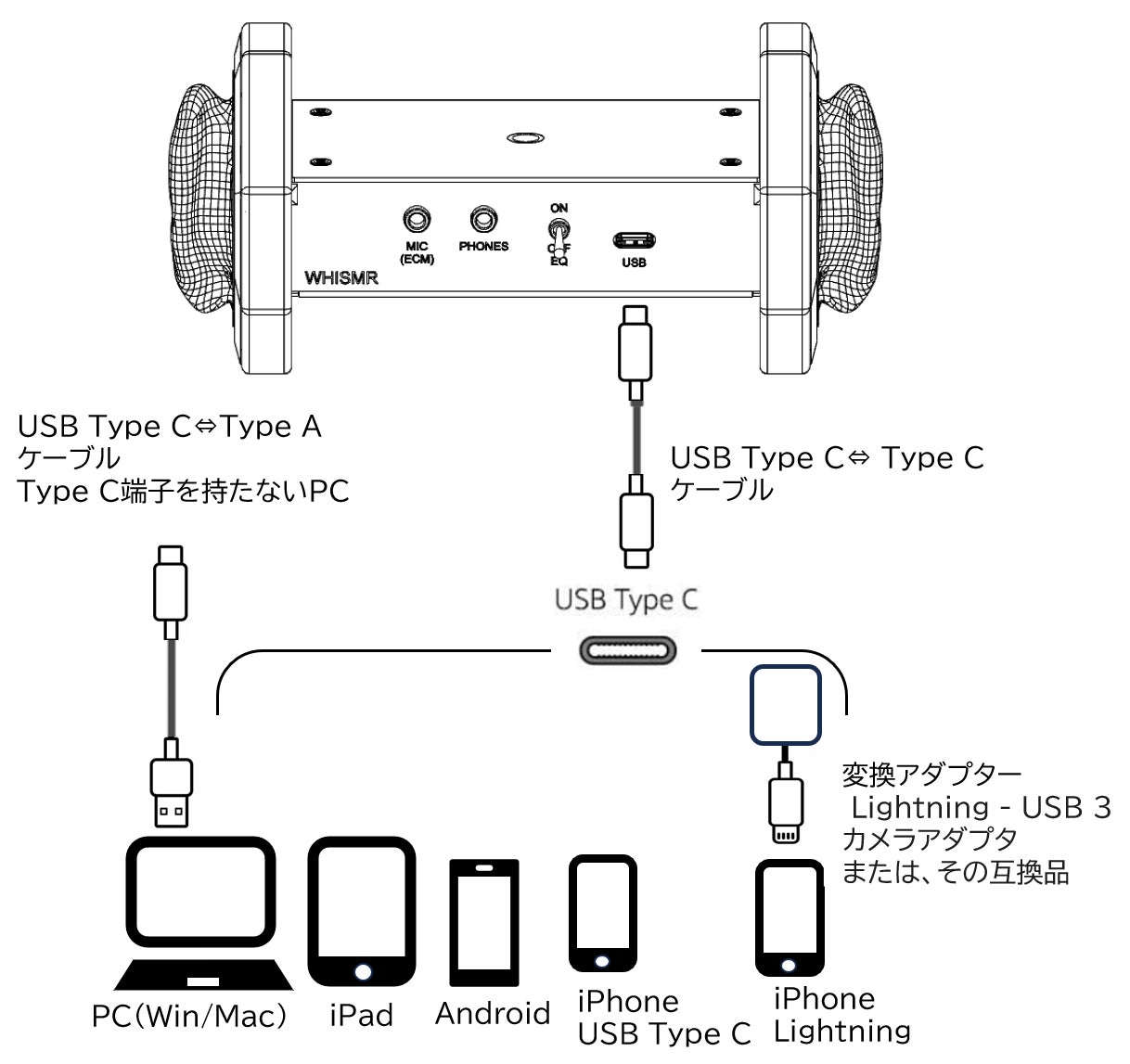 オーディオインターフェースを内蔵しType-Cケーブルとスマホだけですぐに使えます。