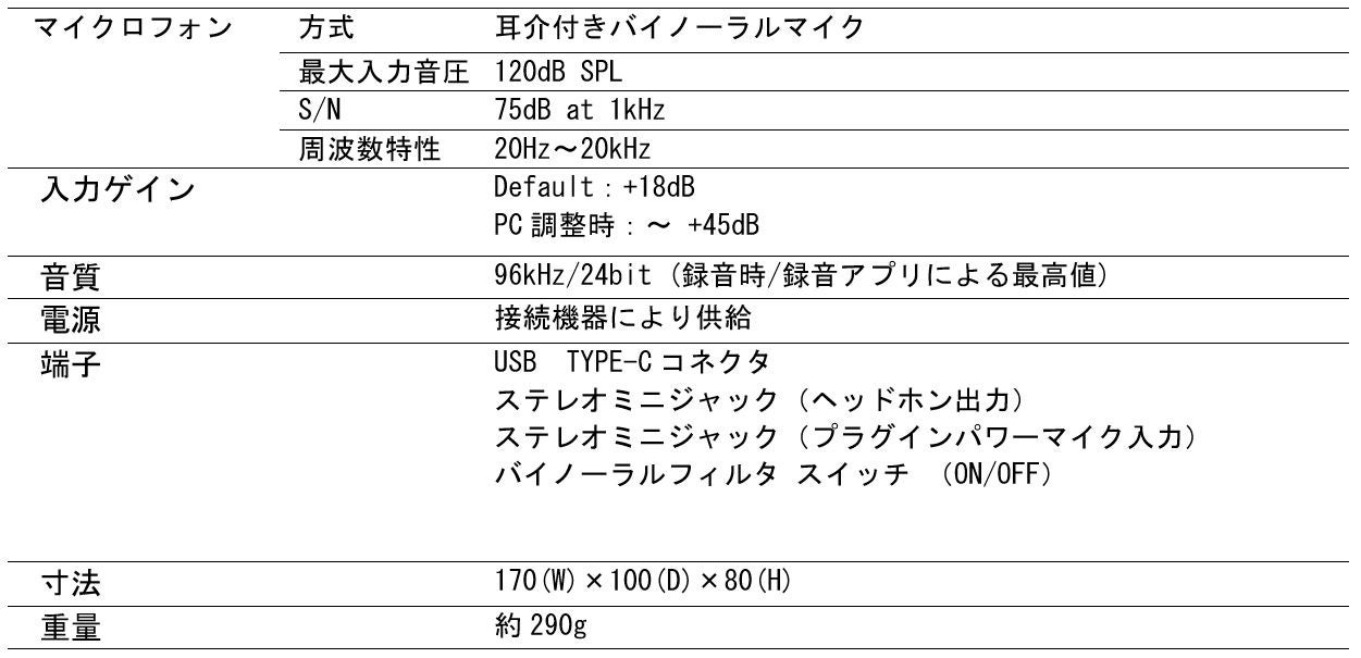 バスパワーで動作するオーディオインターフェースを内蔵し、更にはデジタルフィルタによるバイノーラル周波数特性の補正フィルタも備え、柔らかいシリコン耳を活用したASMRから没入感ある立体音響録音まで幅広い用途に対応します。