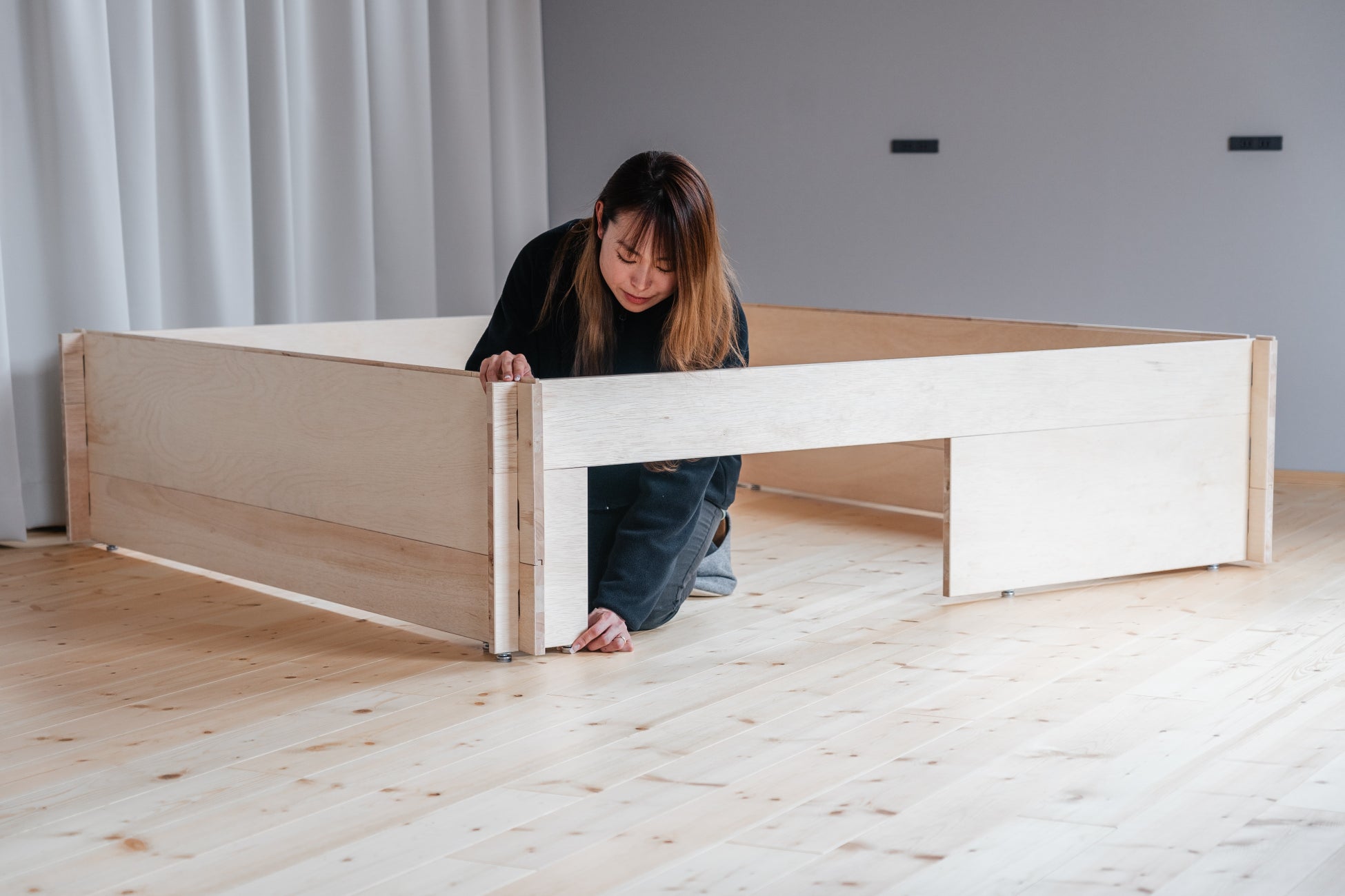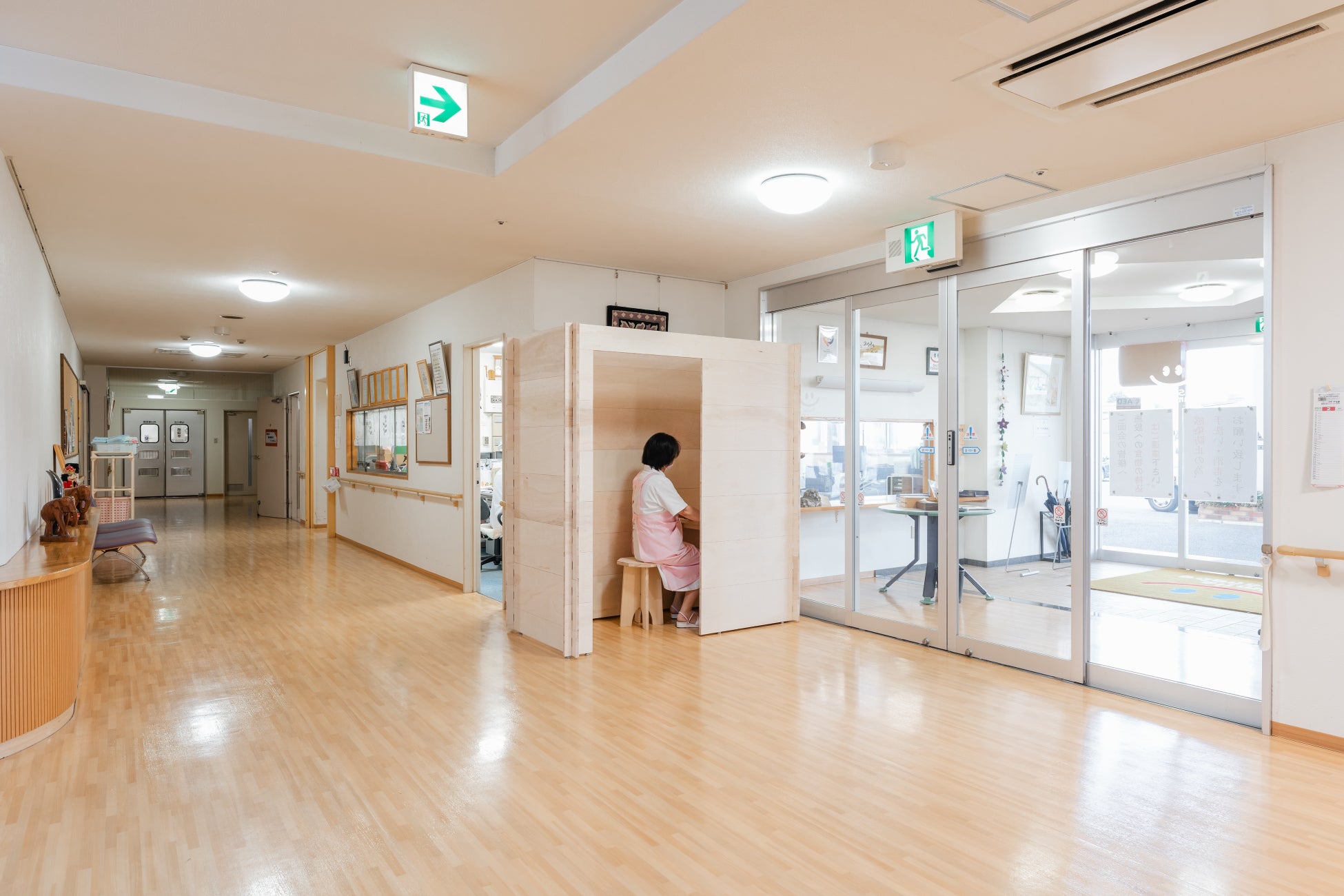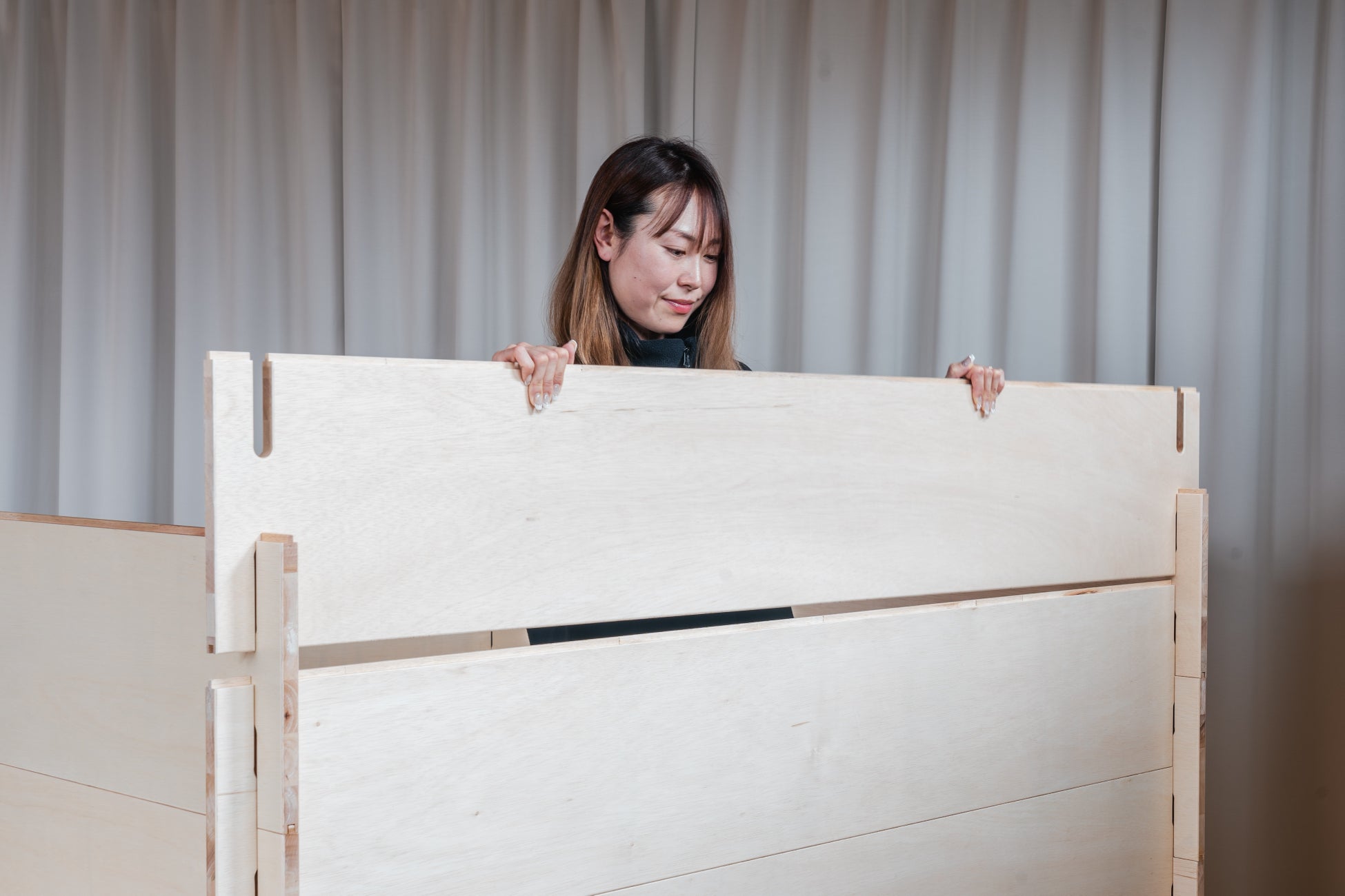 特別な工具・工事が不要なKUMIGUは、女性でも1人10分で組み立て可能です。木組みの空間は、ワークスペースや休憩スペース、荷物置き場などあらゆる用途にフィットします。スライドドア、天井、コンセントなどオプションも豊富で、皆様の施設のニーズにぴったりな空間をご提供可能です。
