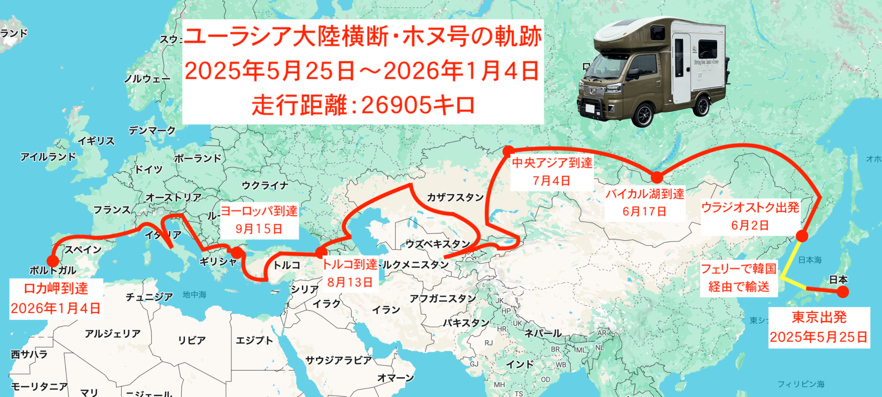 フォトグラファーのマルと寿司シェフのユウコ(夫婦)は、軽キャンピングカーの「ホヌ号」とともに2025年5月下旬に東京を出発しました。鳥取県・境港からロシアの極東の街・ウラジオストクまで船で運び、そこから西へ自走すること26,905km。約7ヶ月の間に17カ国を経由し、年明けすぐの2026年1月4日、ついにユーラシア大陸の最西端であるポルトガルのロカ岬に到達いたしました。