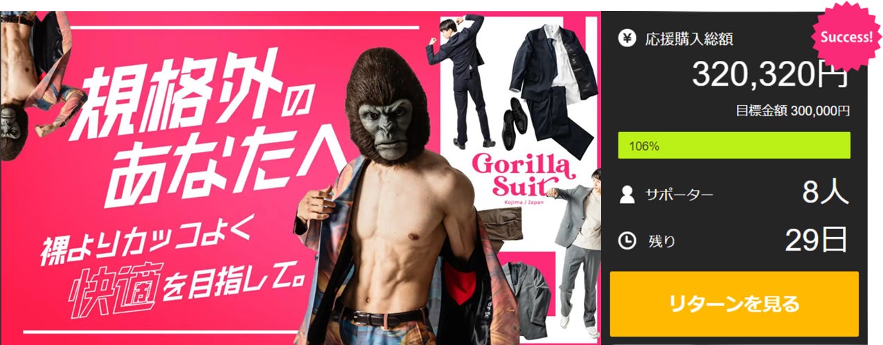 【開始5時間で目標達成】筋肉質な男性を輝かせるビジネススーツの新概念「ゴリラスーツ」クラウドファンディング挑戦中