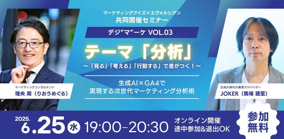 マーケティング戦略の専門家・理央 周氏と、デジタル実践のプロ・JOKER(馬場建至)氏がタッグを組んでお届けする『デジ"マ"ーケ03』が、2025年6月25日(水)に開催されます。