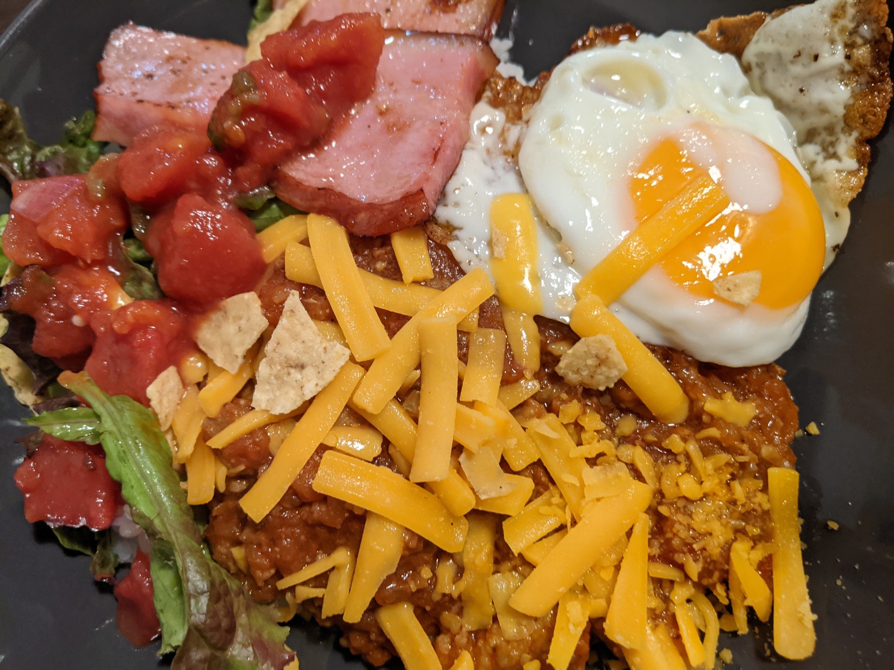 タコライスにベーコンと目玉焼きを乗せた、恐竜の卵とワイルドな雰囲気をイメージした