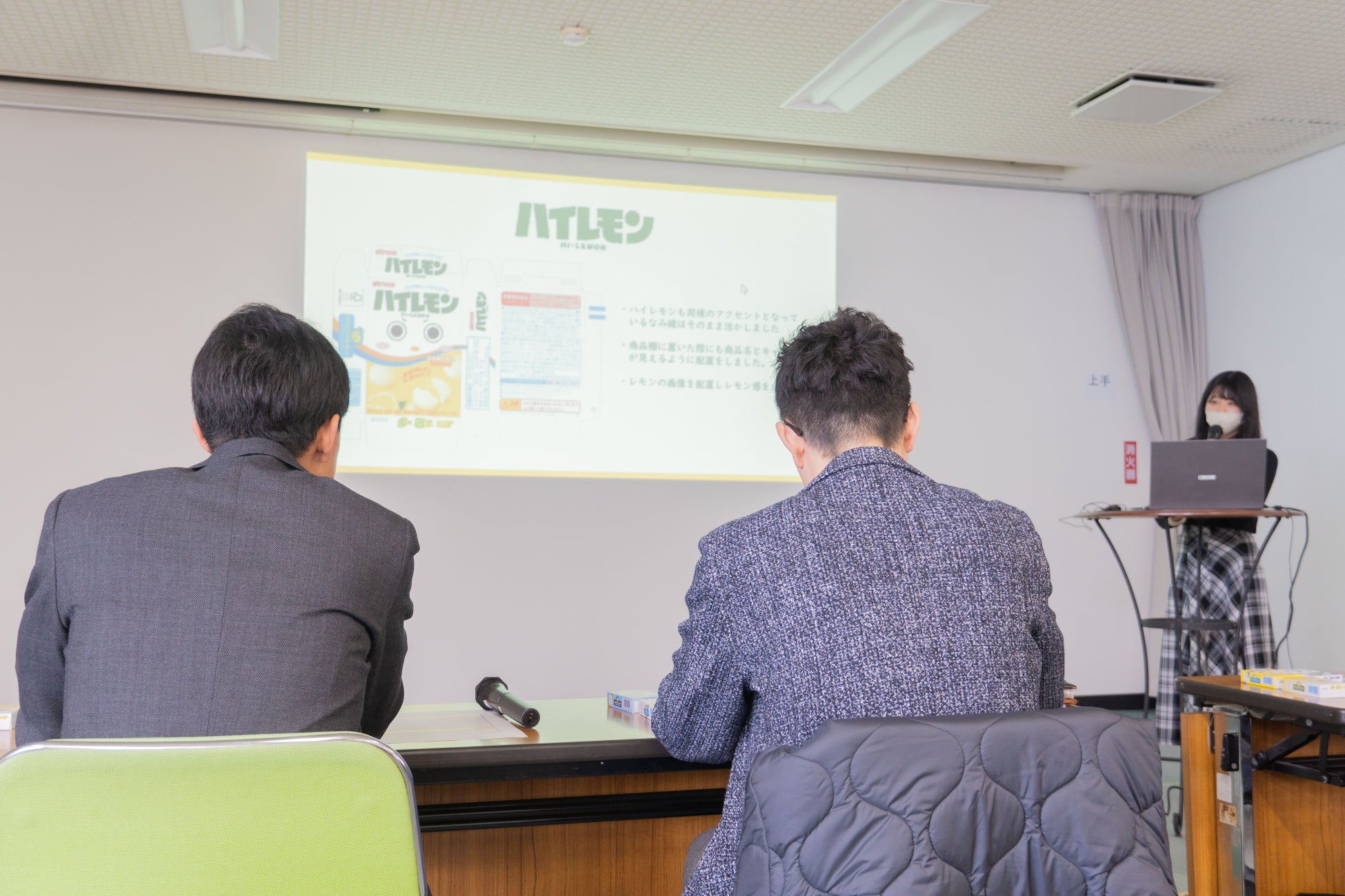 今年1月に行われた成果報告会には27名の学生が参加。学生たちは長年親しまれてきた「ヨーグレット」「ハイレモン」の魅力を再発見しつつ、若い感性による新たな価値提案に挑戦。商品イメージや消費者の視点を深く考えながら、自由な発想でパッケージデザイン創作に取り組みました。1月に行われた作品発表の場では、合計13件の魅力的なデザインが提案された中で、西山萌珈さん(岡学園トータルデザインアカデミー当時2年)が考案したデザインを、消費者に最も親しまれ、ブランドの強み、特長が反映されている点を評価し、実際の商品に採用が決定しました。