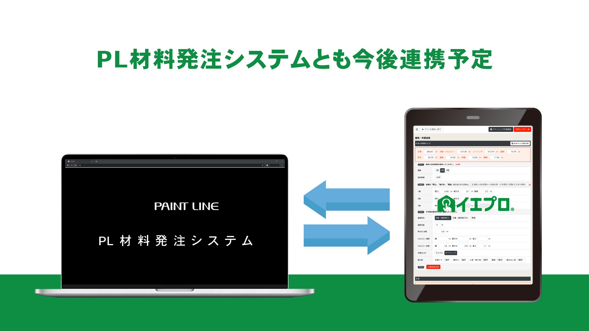 「PLイエプロ」は今後、PAINT LINEジャパンの材料発注システムと連携し、外壁塗装に必要な塗料や関連材料をシステム上から簡単に発注できるようになります。これにより、工事に必要な材料の管理と発注が効率化され、在庫の最適化と納期の短縮が可能となります。