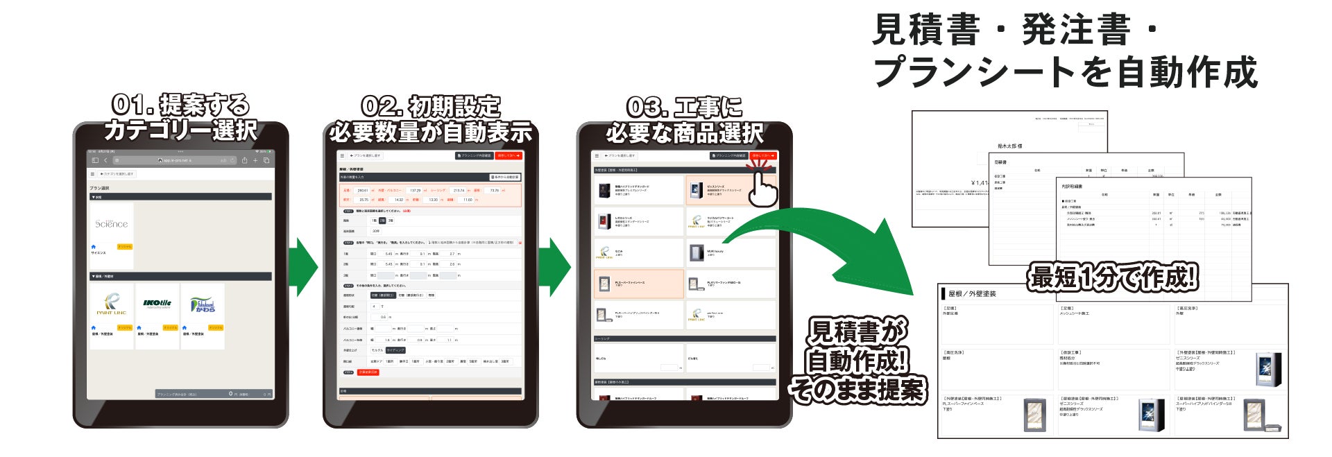 「PLイエプロ」は、塗装業務の見積り作成を1分以内で完了させることができ、提案書や発注書も自動的に作成されます。これにより、加盟店が商談の際に即座に顧客に提案を行うことができ、競争力が向上します。