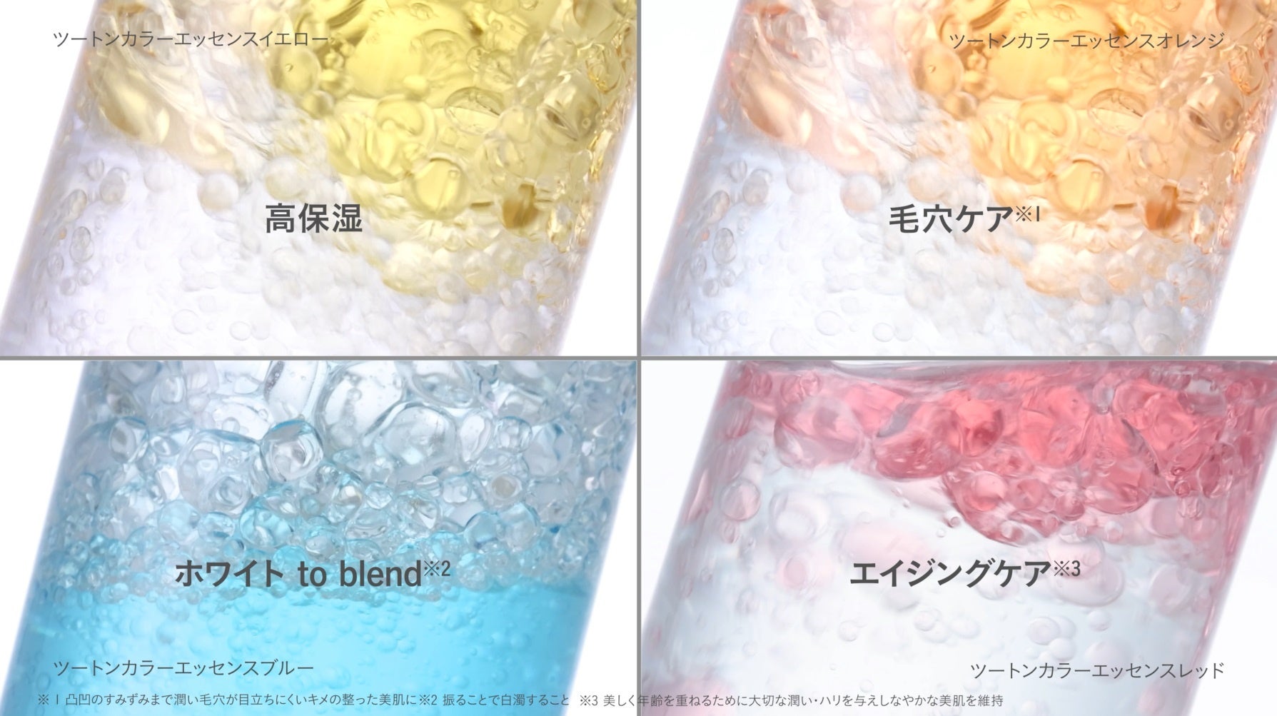 その工場で作られたオーガニック処方の美容液で、お悩み別に特化した「高保湿」「毛穴ケア※1」「ホワイトto blend※2」「エイジングケア※3」の4色を展開します。