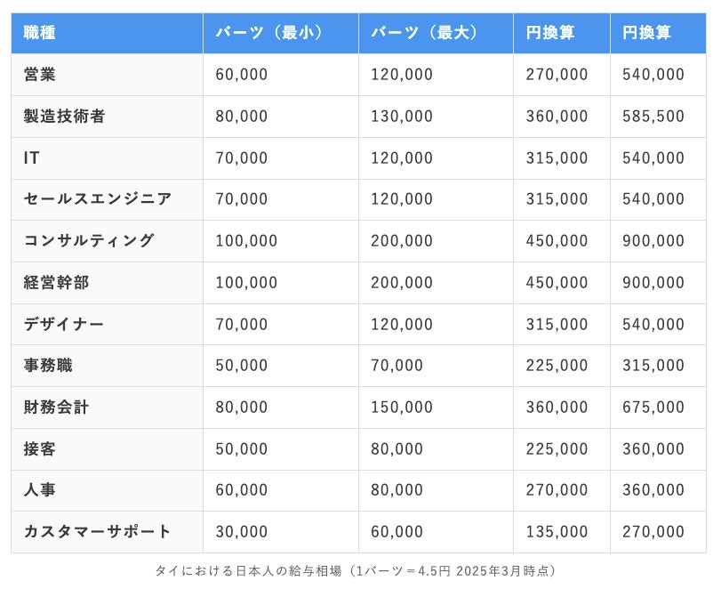 ■ 【職種別】タイ現地採用の給与相場(1バーツ=約4.5円)