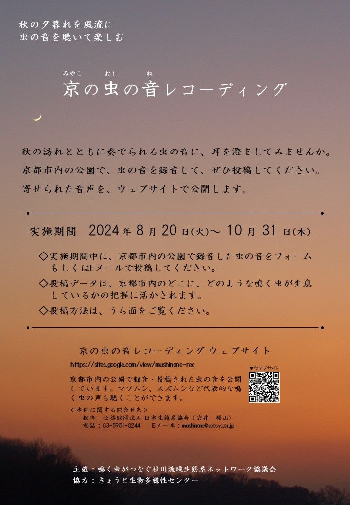 鳴く虫がつなぐ桂川流域生態系ネットワーク協議会は、2024年8月20日から10月31日の期間中に、京都市内の公園で録音された虫の音の投稿を募集します。