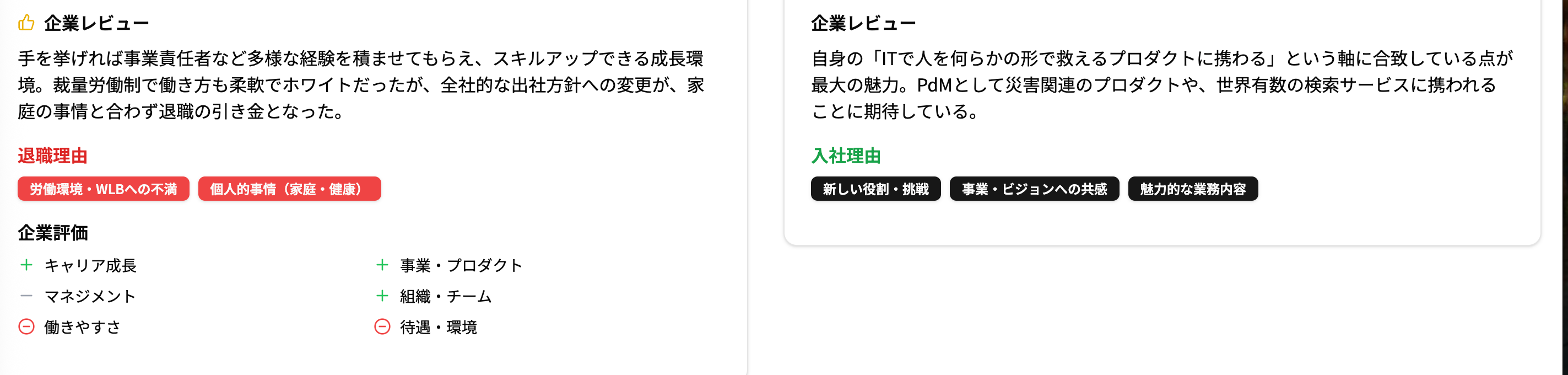 AIが体験談を解析し、ポジティブな入社理由やリアルな退職理由を抽出・分類して表示。給与や待遇といった定量的なデータだけでは見えてこない、企業のカルチャーや組織の実態を深く理解する手助けとなります。