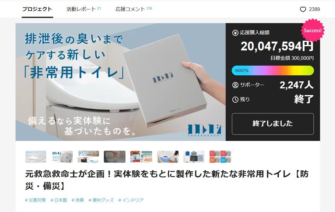 「ヨカレカシ」非常用トイレをなんとか世の中に広めたいとの一心で挑んだクラウドファンディング。ありがたいことに沢山の応援を賜り、マクアケ非常用トイレ部門におけるギネス記録を樹立。「Good Project」に認定されました。