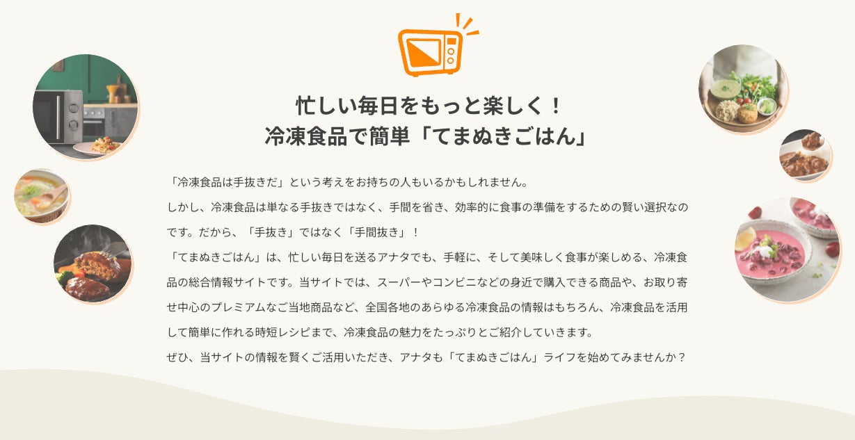 「てまぬきごはん」は、忙しい毎日を送るアナタでも、手軽に、そして美味しく食事が楽しめる、冷凍食品の総合情報サイトです。当サイトでは、スーパーやコンビニなどの身近で購入できる商品や、お取り寄せ中心のプレミアムなご当地商品など、全国各地のあらゆる冷凍食品の情報はもちろん、冷凍食品を活用して簡単に作れる時短レシピまで、冷凍食品の魅力をたっぷりとご紹介していきます。