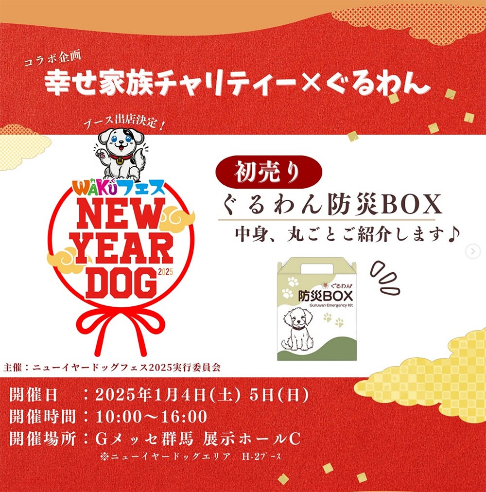 ペット同伴可能な施設検索アプリ「ぐるわん」を提供する株式会社ぐるわん(本社:静岡県牧之原市静波2220-2、代表取締役:岩田うの)は、災害時にペットとの避難を支援する「ぐるわん防災BOX」を、2025年1月4日~5日に群馬県高崎市で開催される「WAKUフェスニューイヤードッグ2025」で展示・販売いたします。ブースでは愛犬家で防災士のタレント時東ぁみさんが運営するチャリティープロジェクトとのコラボレーションにより、ペット防災の課題解決を目指します。「ぐるわん防災BOX」は能登半島地震の被災者の声をもとに開発。避難時に不足したペットフードや水、衛生用品などを網羅した、安心のオールインワンパッケージです。あわせて、全国のペット同伴可能な施設を検索できる「ぐるわん」アプリを活用することで、飼い主は安心して避難場所を迅速に見つけることができます。