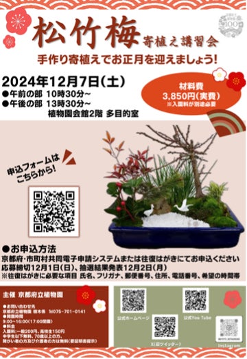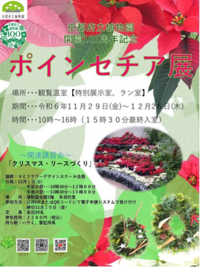 また、京都府立植物園100周年記念として、2024年11月29日(金)から12月26日(木)までの期間限定で開催される「ポインセチア展」、2024年12月1日(日)に開催される「クリスマス・リースづくり」ワークショップや、2024年12月7日(土)に開催される「松竹梅寄植え講習会」などの各種ワークショップも開催されることから、植物園で栽培される植物を見るだけでなく、体験を通して愛でることが出来き、本イベントをきっかけに、植物そのものにこれまで以上にご興味を持って頂く機会をご用意致します。