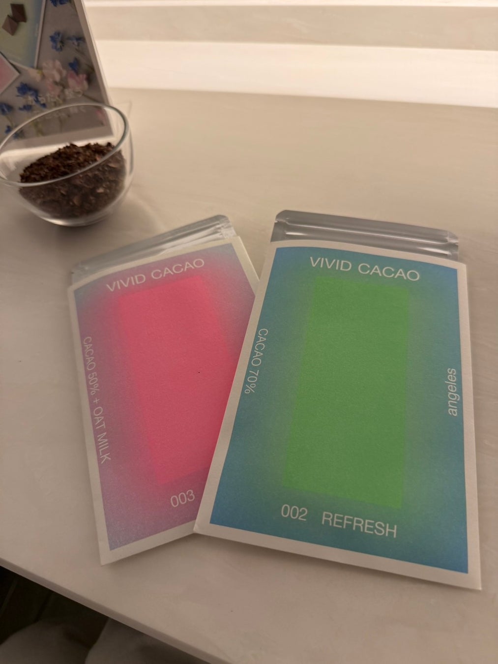 施術後には<VIVID CACAO>002 REFRESHをひとかけ頂きます。ゆったりとした目覚めの中に、チョコレートの甘い刺激がだんだんと現実世界へ引き戻してくれるようです。施術後は血行が良くなっているからか、002のもつビタミンCの酸味とカカオの酸味が全身に広がっていくのが感じられました。