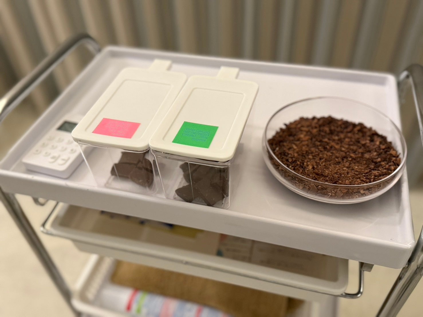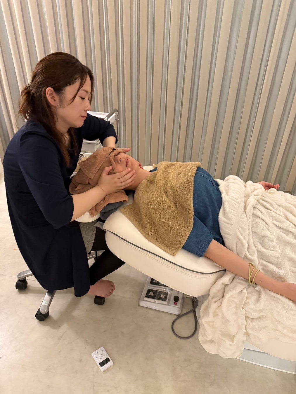 噛むのではなく、ゆっくりと口の中で溶かすようにチョコレートを味わいます。カカオの酸味と共にオーツミルクの香ばしさや苦みを感じながら、まずは座りながらの施術がスタート。