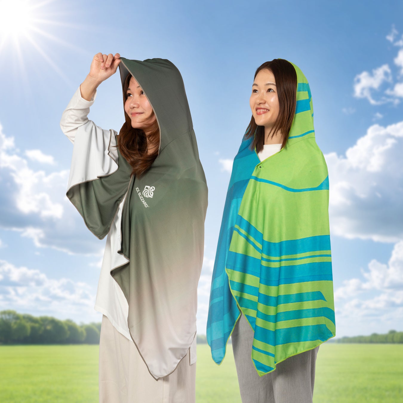 本製品は、水分が蒸発するときに熱を奪う「気化熱」を利用しています。ポンチョを水に濡らし、しっかり絞り、振って着るだけで、即座に高い冷却効果を発揮。その冷たさは、「まるで冷蔵庫の中にいるみたい」という声が届くほどです。蛇口やペットボトルの水があればどこでも繰り返し使える、エコな熱中症対策アイテム。UVカット加工済みのため、日差しの強い屋外でも安心です。