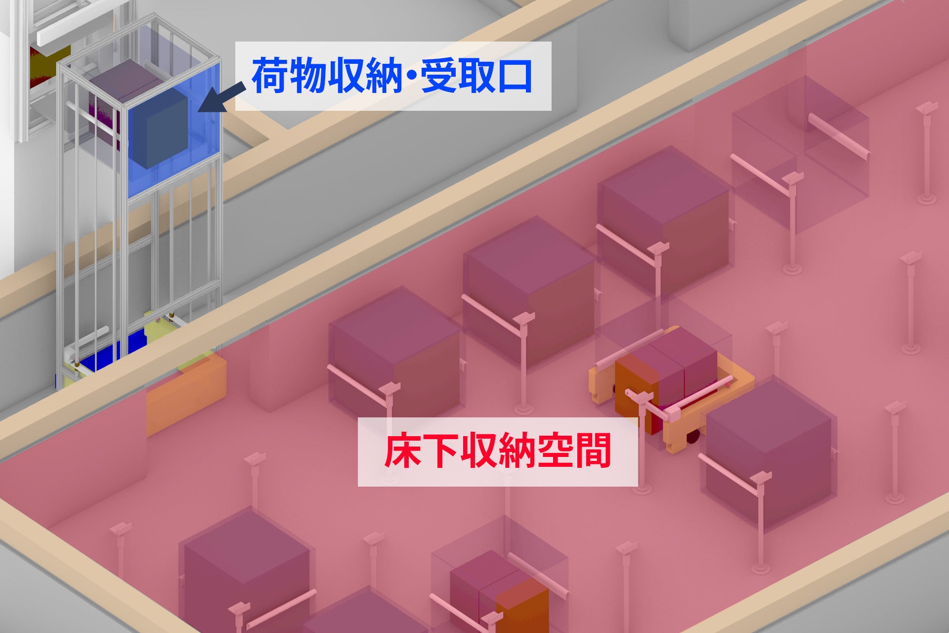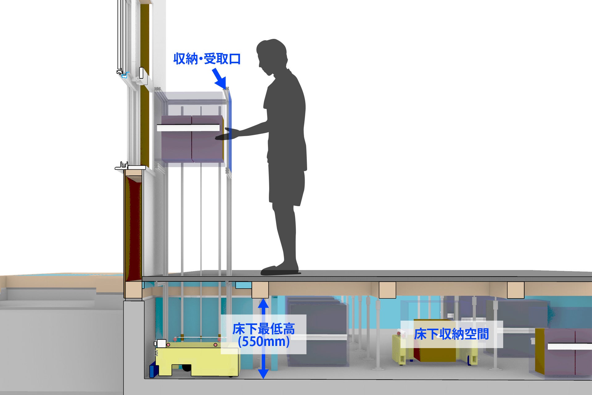 ユーザーは、居室に設けられた荷物の受け渡し口に収納したい荷物を収めます。荷物は床下エレベーターにより床下の収納空間へと降り、床下で待機している荷物運搬ロボットへ引き渡され、所定の場所に収納されます。