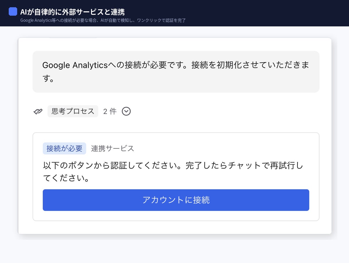 明確で簡単なツール連携。AIにどのツールを使わせるか(Slack、Gmail、Google Analyticsなど)を、画面上のテキストの指示と簡単な設定だけで明確に指定・連携できます。もちろんワンクリックで権限を削除することもできます。