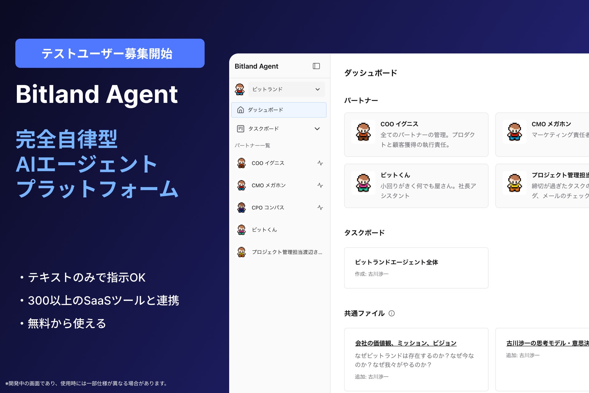 AIによる自律運営企業を生み出す仕組みを作る株式会社ビットランド(本社:東京都新宿区 代表取締役:古川渉一 以下ビットランド)は、自然言語の指示だけで複雑な業務を自律的に実行する次世代AIエージェントプラットフォーム「Bitland Agent(ビットランドエージェント)」のウェイティングリスト登録受付を本日より開始いたしました。