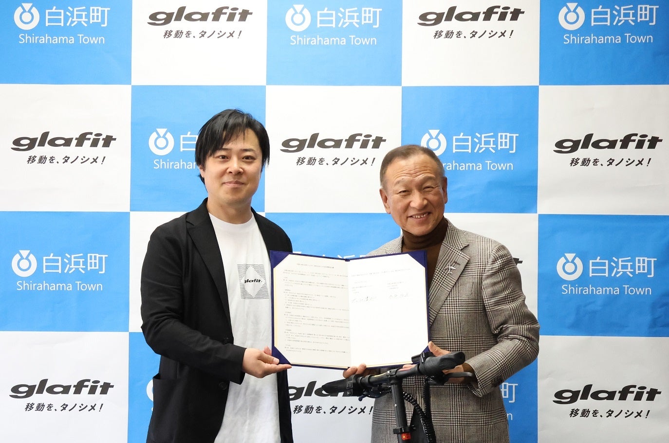 白浜町は令和7年3月26日(水曜) glafit 株式会社(代表取締役CEO 鳴海禎造)と、電動パーソナルモビリティの利活用を通じ、観光振興、地域交通、脱炭素社会などの地域課題の解決に取り組むことで合意し、包括連携協定を締結いたしました。