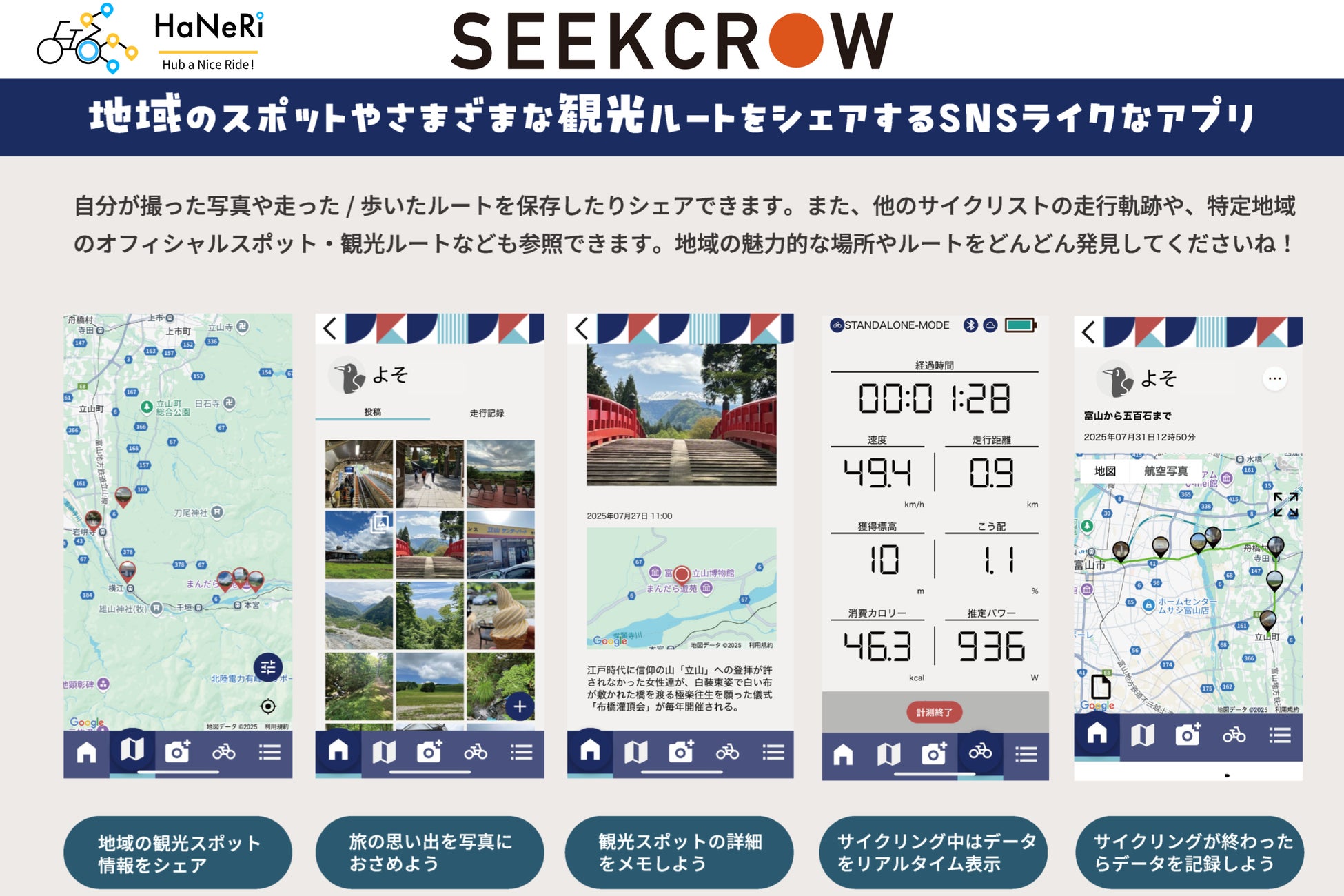当社が提供する「SEEKCROW(シークロウ)」は、サイクリングを通じて観光スポットやルートを発見・記録・共有できる、SNS型のサイクリングアプリです。