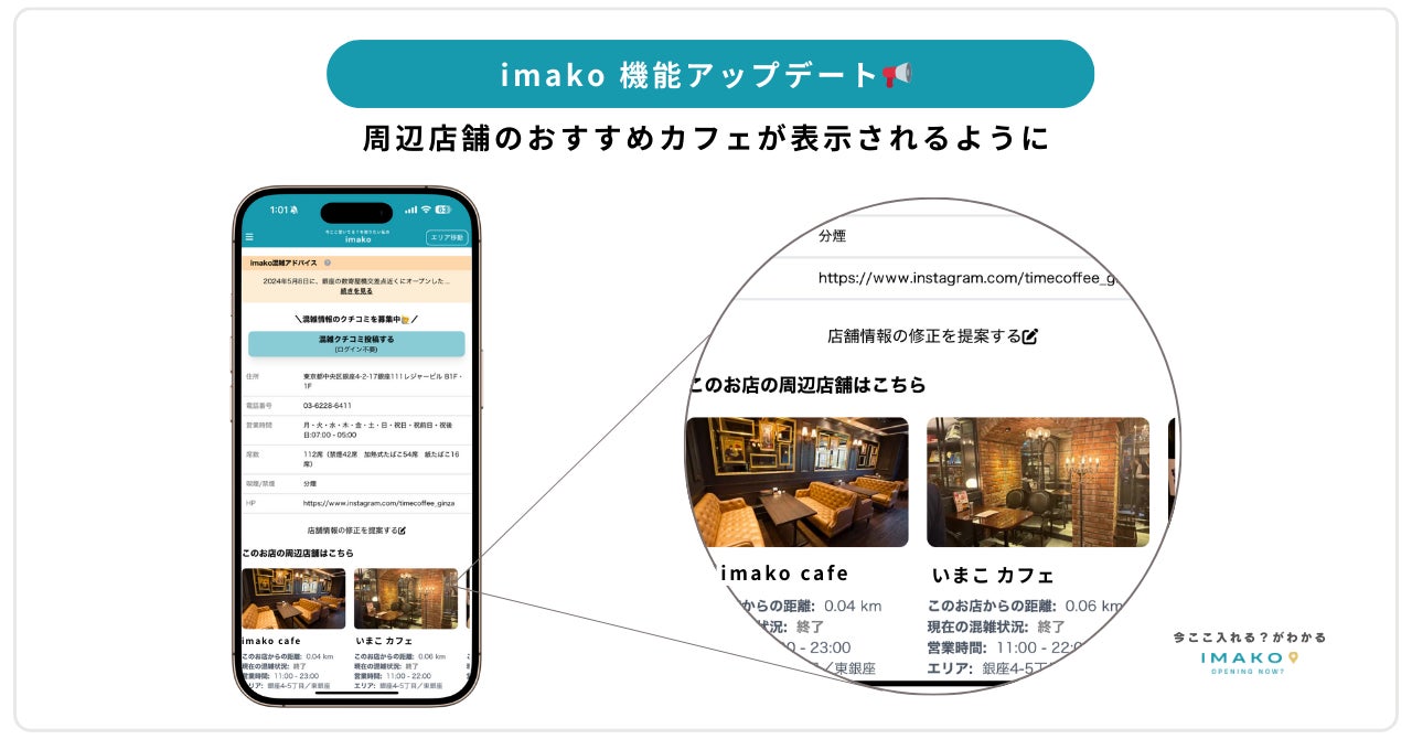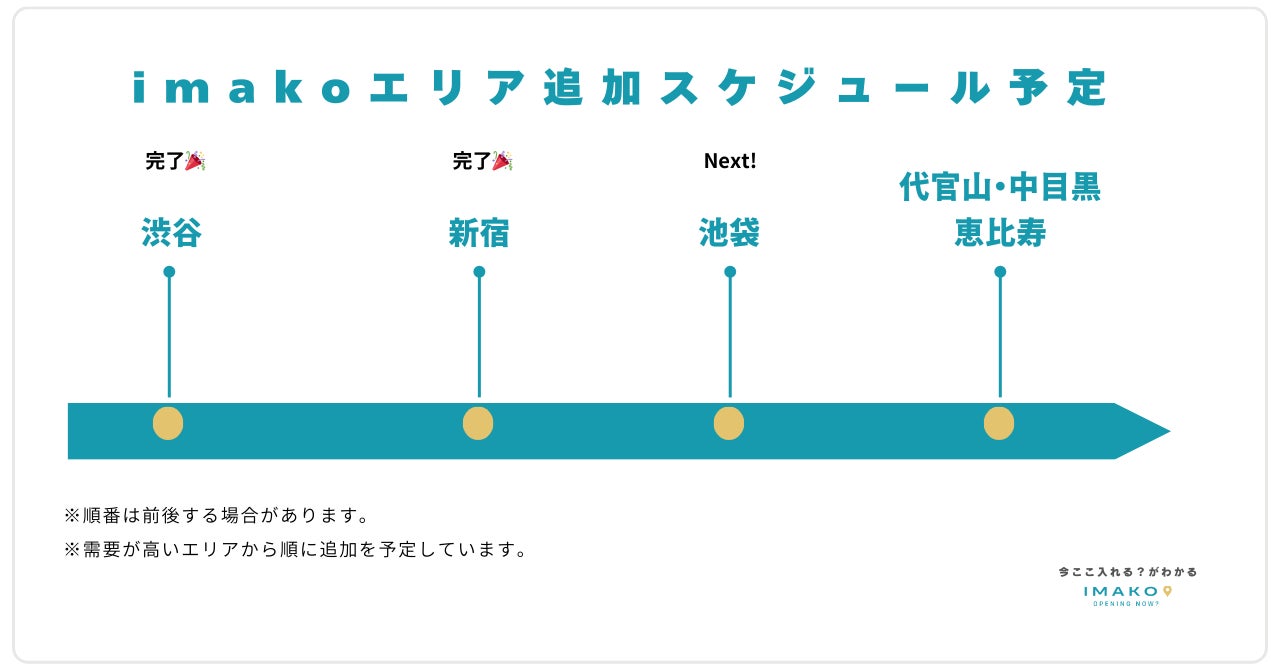 imakoは、引き続き混雑調査や口コミなどの情報を通して、要望の多いエリアから順に週で100件ずつのペースでカフェ混雑情報を追加していく予定です。