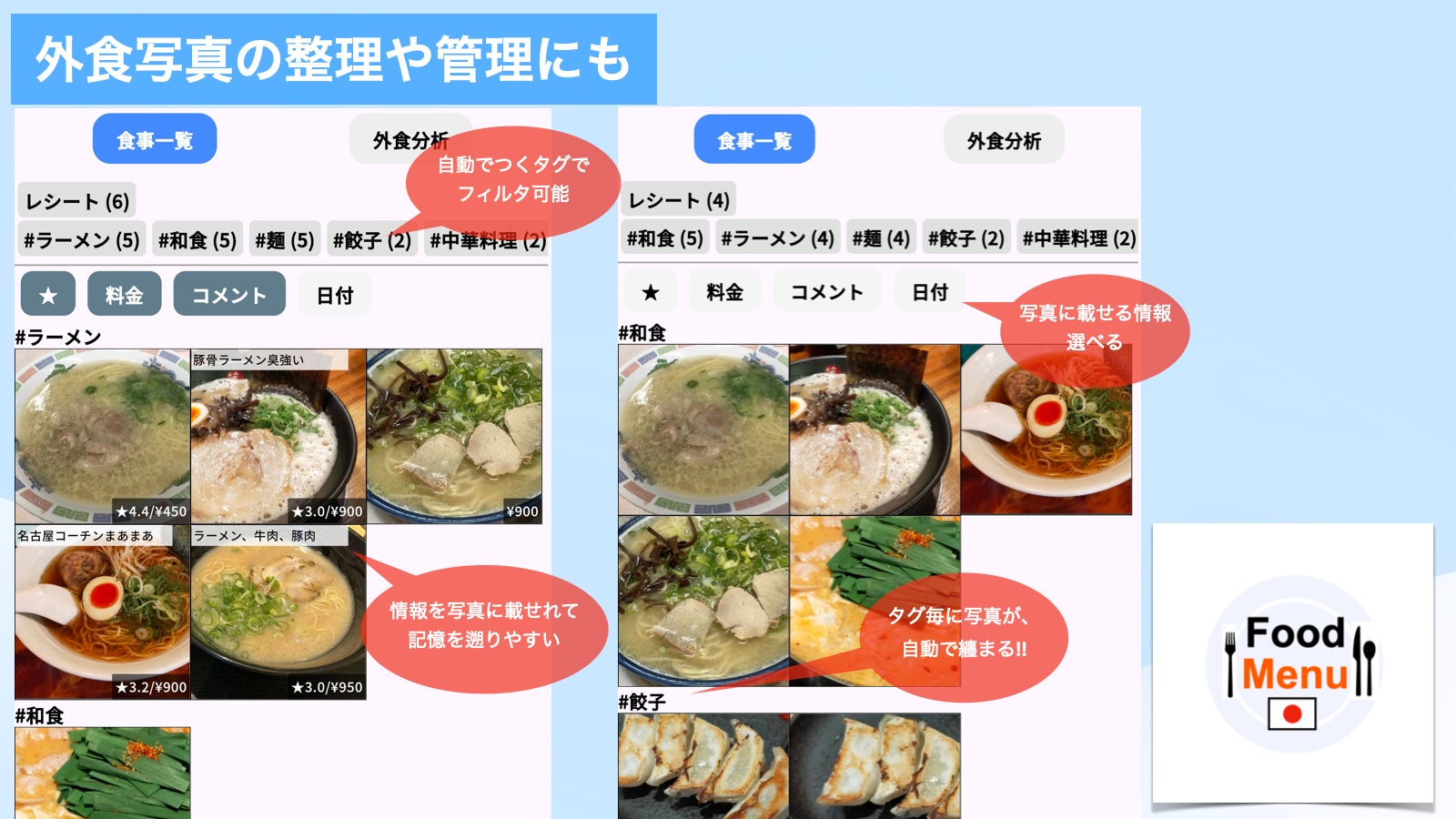 食事名やコメントを基にタグが自動付与され、写真がカテゴリ別に整理されます。