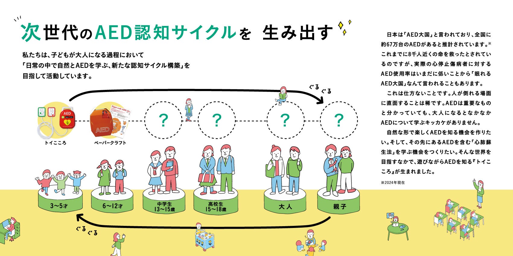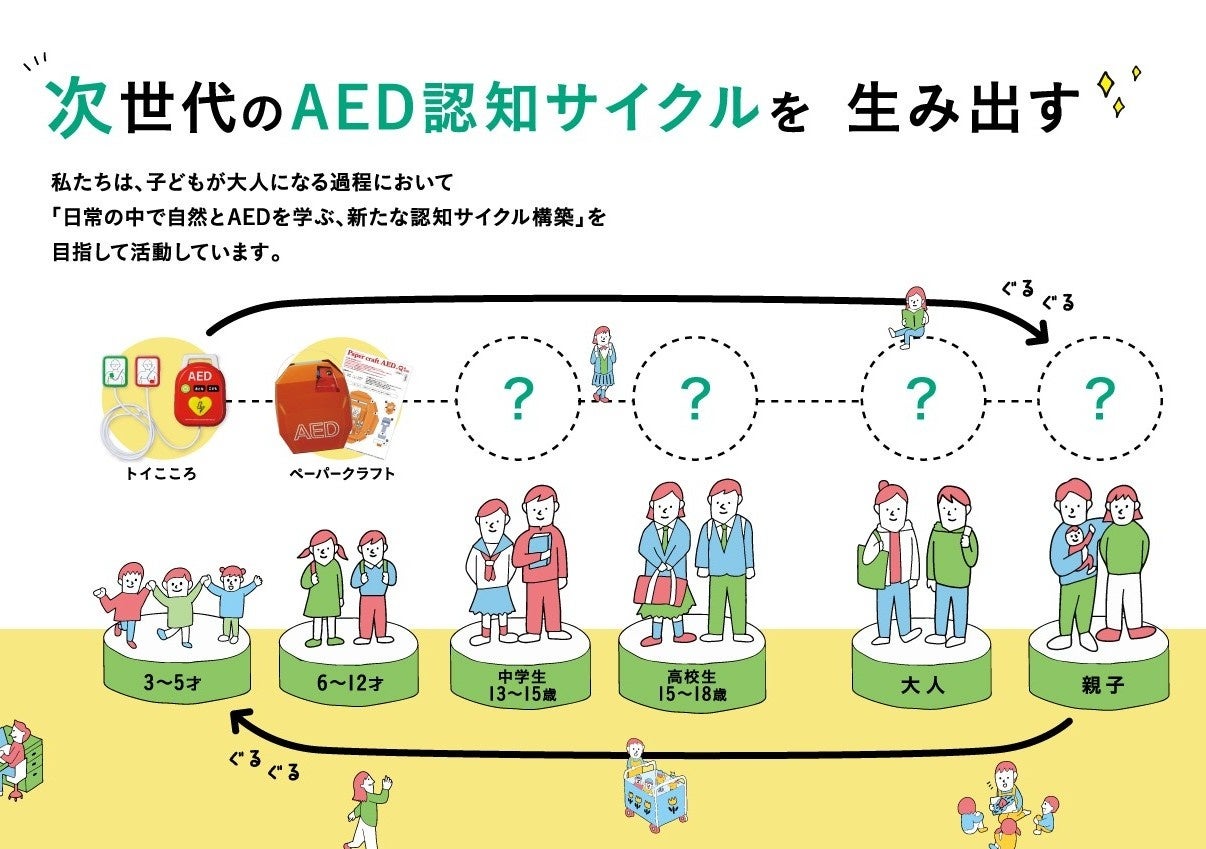子どもたちが遊びの中でAEDを知り、その家族や周囲へ自然に興味が広がっていき、“学習ではなく、興味から始まるAED認知サイクル” を社会に根づかせること。