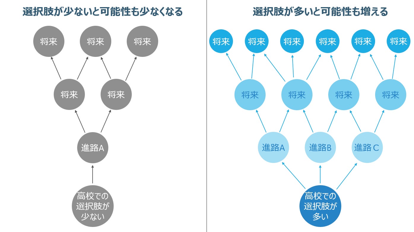 講話では、まず初めに髙野の苦い経験を伝えました。苦労したことを伝えるだけでなく、選択肢を知っていることと知らないことでは将来に大きな差が生まれることを図解して理解してもらいました。