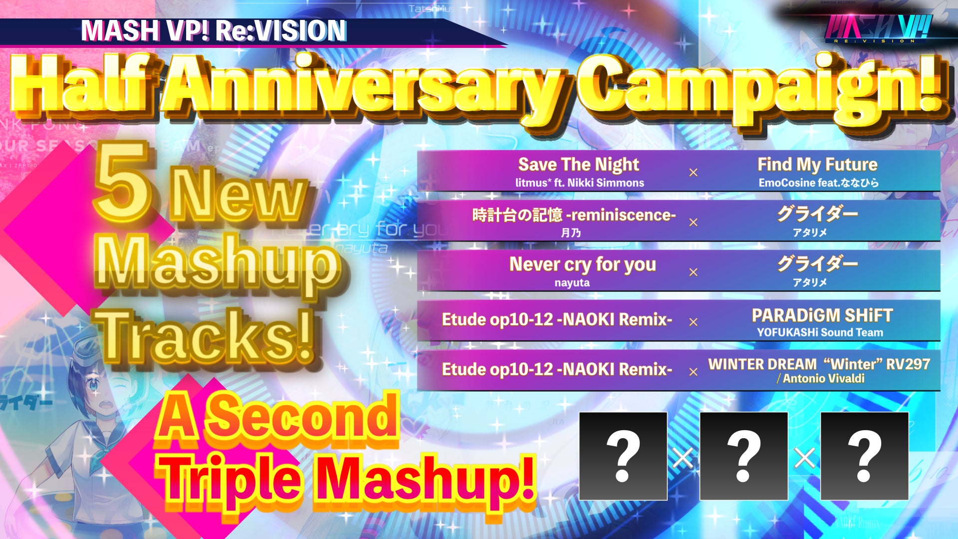 無料追加楽曲など盛りだくさんの内容で、『MASH VP! Re:VISION』ならではのゲーム体験をプレイヤーの皆さまにお届けします。今後の続報にもぜひご期待ください。