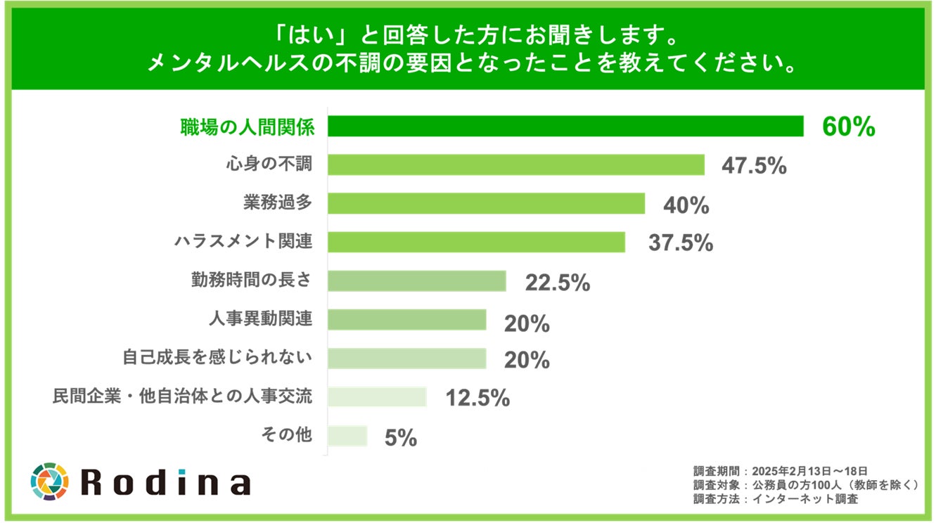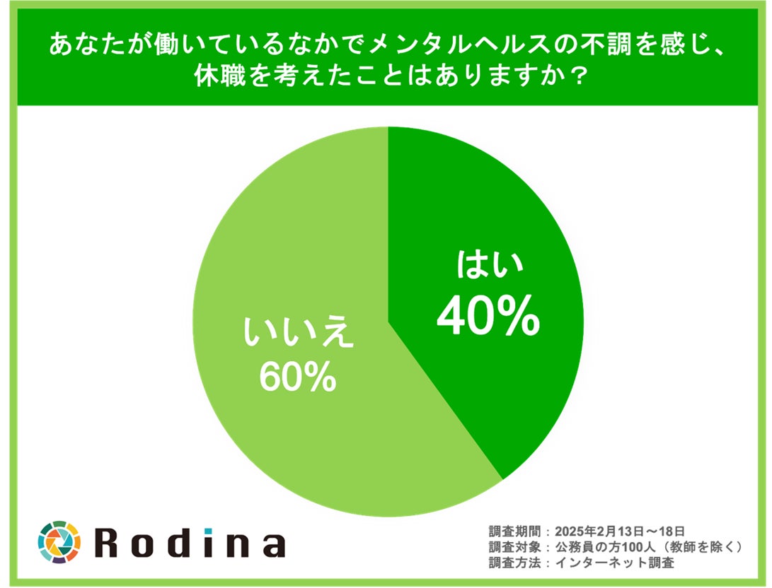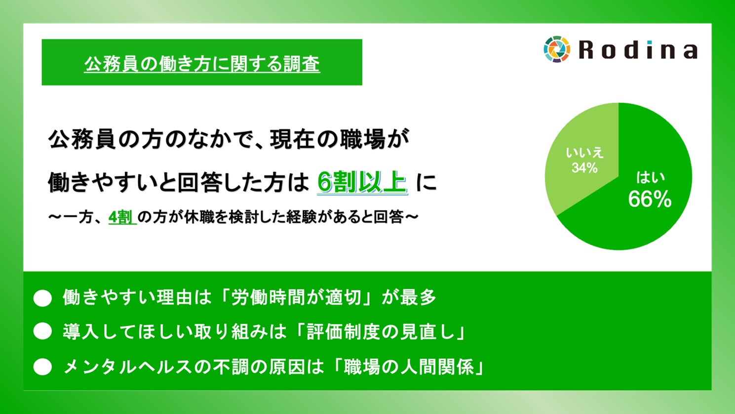 復職・就職を支援し、リワーク事業を展開する株式会社Rodina(本社:広島県広島市、代表取締役:山田 康輔)は、教師を除く公務員の方100名を対象とし、働き方に関する調査を実施いたしました。