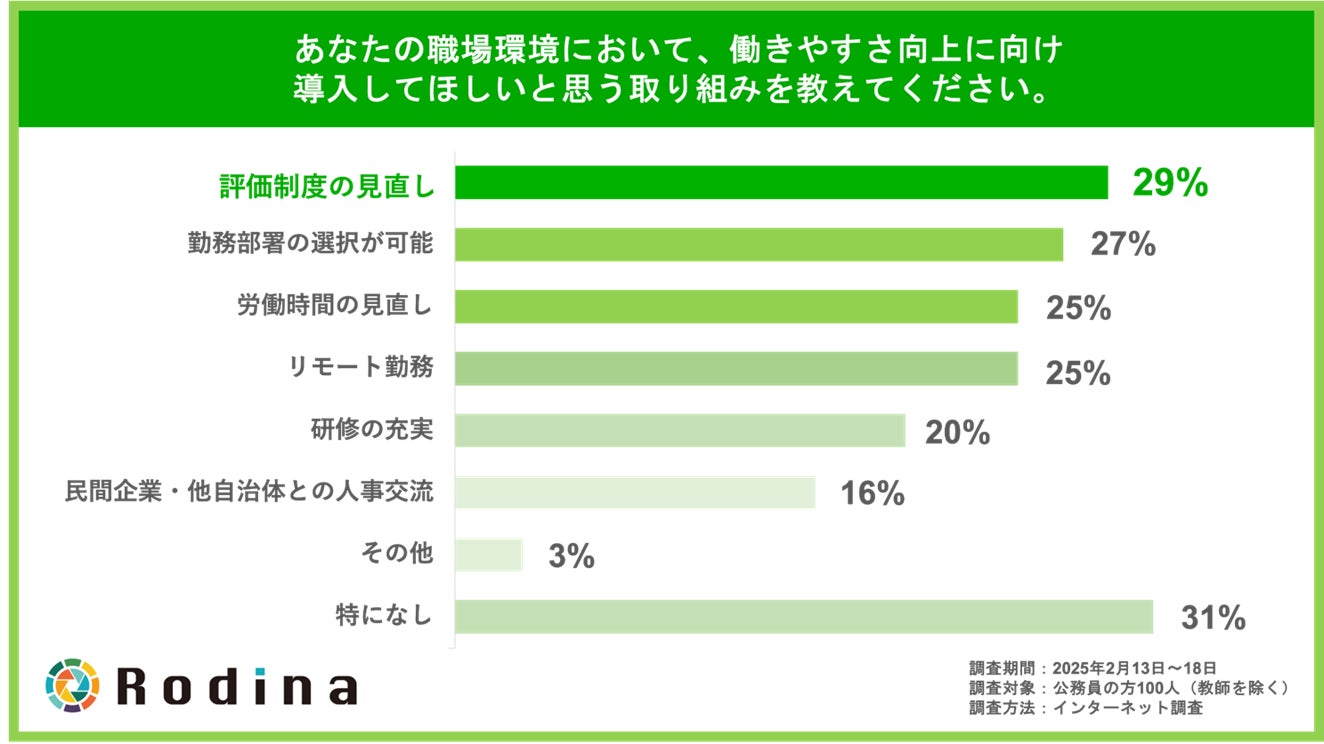 Q. あなたの職場環境において、働きやすさ向上に向け導入してほしいと思う取り組みを教えてください。
