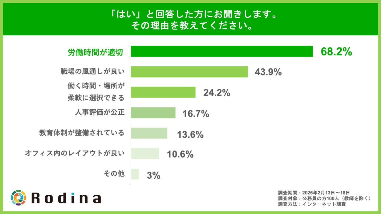 前問の「現在の職場は、働きやすいと感じていますか?」という設問に対し「はい」と回答した方を対象に、その理由について聞いたところ、「労働時間が適切(68.2%)」と回答した方がもっとも多い結果となりました。勤務時間は、地方公務員の場合は各自治体の条例で定められていますが、多くの自治体では国家公務員と同じく、勤務時間を1日あたり7時間45分となっています。