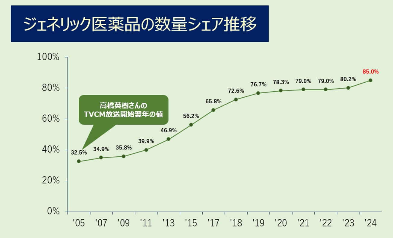 国によるジェネリック医薬品の使用促進策も相まって、現在ではジェネリック医薬品のシェアが数量ベースで85%になりました(資料②)。今日に至るまでに高橋英樹さんには10本以上のテレビCMにご出演いただき(資料③)、より多くの方にジェネリック医薬品を認知していただきました。ジェネリック医薬品の認知度や社会的な役割の理解醸成について、高橋英樹さんの貢献に改めて感謝申し上げます。