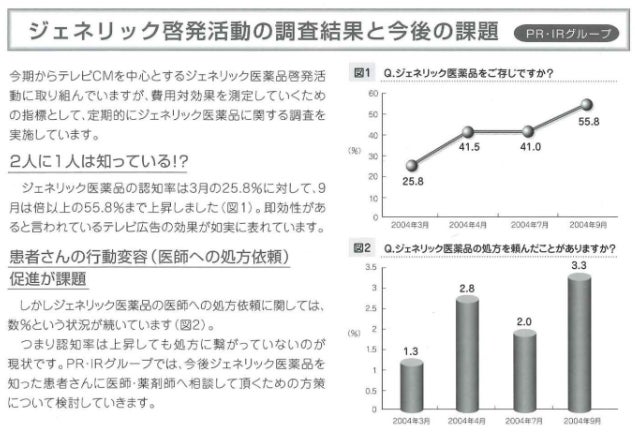 当社は、患者さんに安価なジェネリック医薬品を届けるため、2004年に高橋英樹さんご出演第1弾となるテレビCMの放送を開始し、ジェネリック医薬品の認知度向上と普及の取り組みを加速させました。テレビCM開始直前の当社・社内報には、ジェネリック医薬品の認知度80%※を目標に取り組みを行うという意気込みが記載されていました。また、テレビCM開始後も、定期的に「ジェネリック医薬品」の認知度の調査を続け、大きな効果があったことが示されています(資料①)。