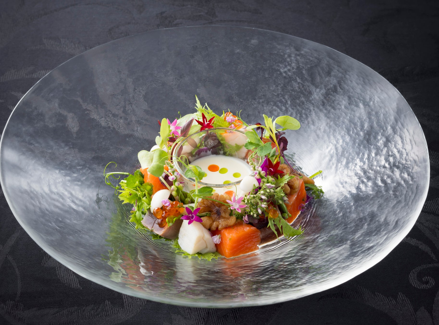 たらば蟹、帆立、まぐろ等の海の幸を、ハーブとともにサラダに仕立てました。ドレッシングは豆乳ベースですが、もち米に麹を加え発酵させた“酒醸(チューニャン)”を合わせることで、独特な風味とコクを感じます。まろやかなドレッシングは、様々な海の幸や野菜とも相性抜群です。