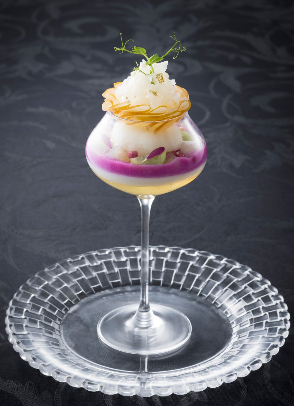 旬の果物、梨をふんだんに使用し、金木犀の秋の香りを白ワインにうつした桂花陳酒が香る、贅沢な中華風パフェ。桂花陳酒のゼリー、クリーミーな杏仁豆腐、紫の菊の花のソース、梨のコンポート、ザクロ、シャインマスカット、梨とライチのシャーベット、白きくらげ等、多種多様な味わいが楽しめる逸品です。皮膚や粘膜の乾燥を潤すと言われている白きくらげを加えているので、見た目の美しさだけでなく、身体にも優しいスイーツです。