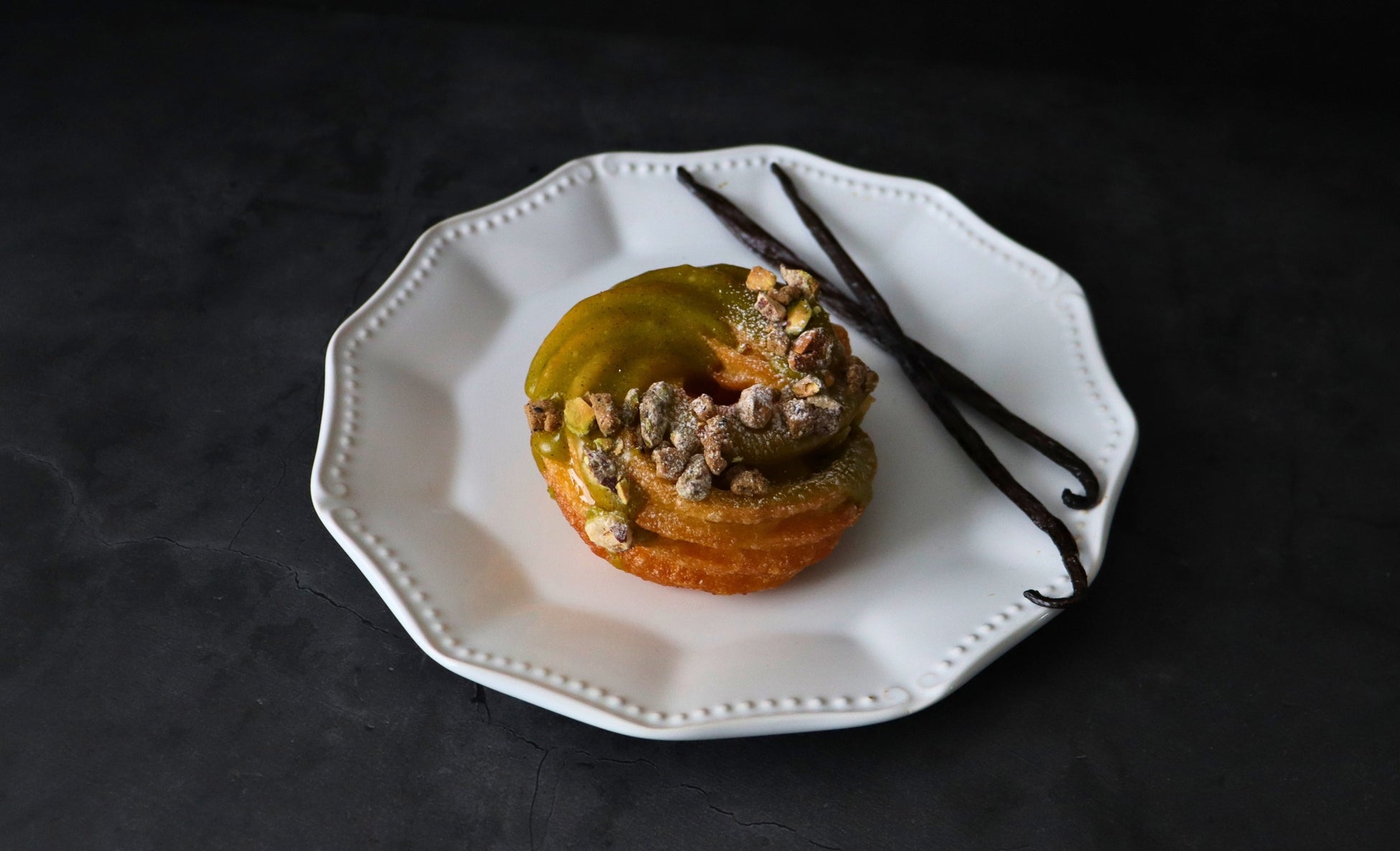 ピスタチオグレーズに、香ばしいピスタチオとバニラのクランブルをトッピング