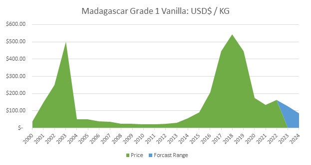 近年、バニラの価格は需給の変動により大きく変動しています。2016年〜2018年の価格高騰により、多くの国がバニラ栽培に参入しましたが、現在は供給過多となり、価格は低水準で推移しています。
