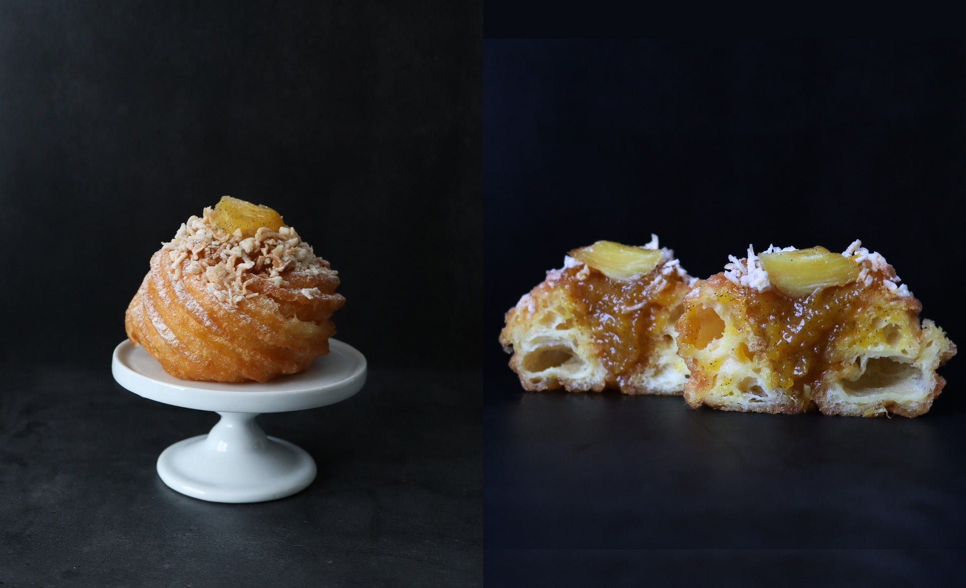 エキゾチックフルーツとバニラのコンフィチュールに、ココナッツサブレを重ねた爽やかな一品