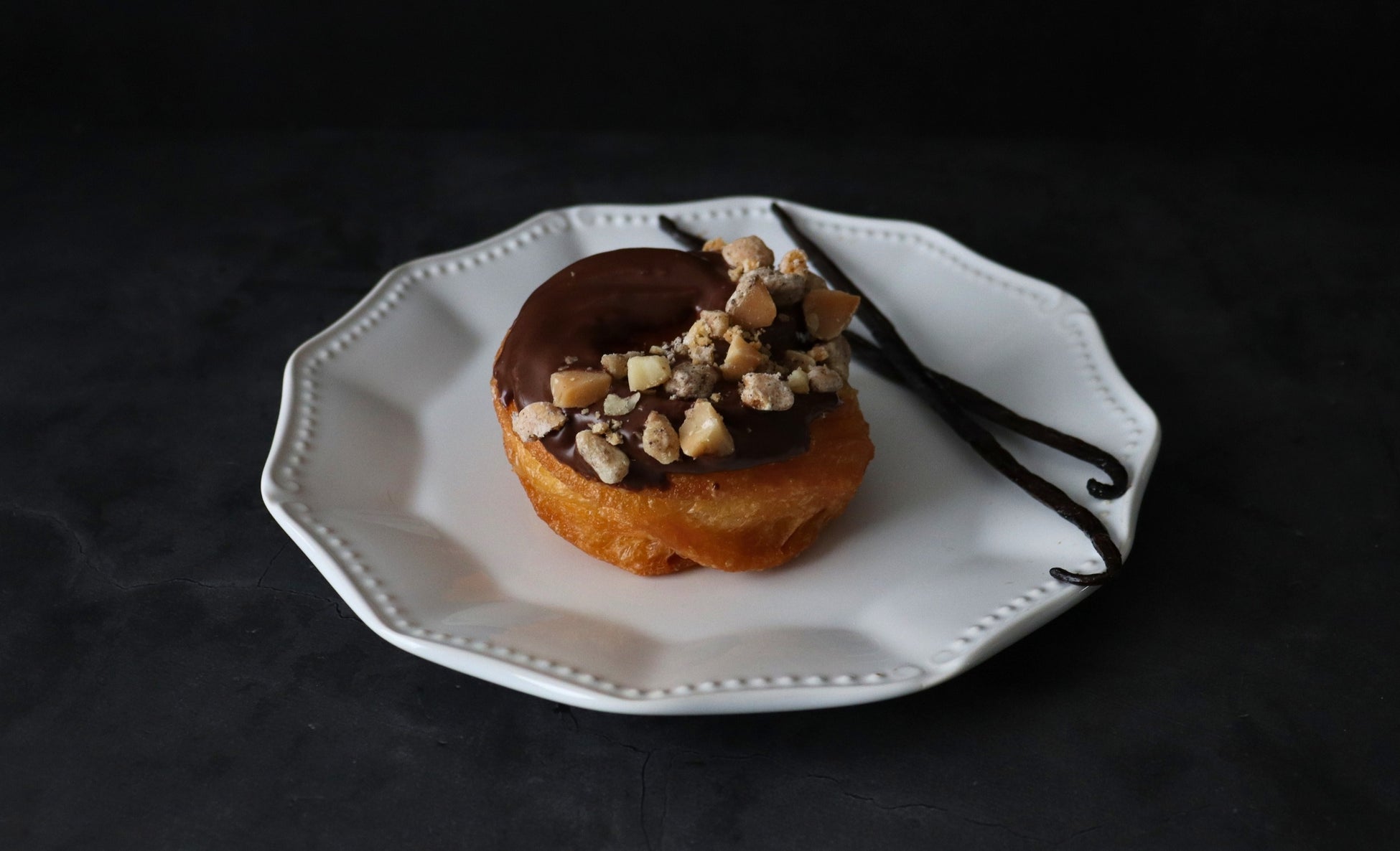 チョコレートに、マカダミアとサブレ・ヒューモルガンを添えたフレンチクルーラー