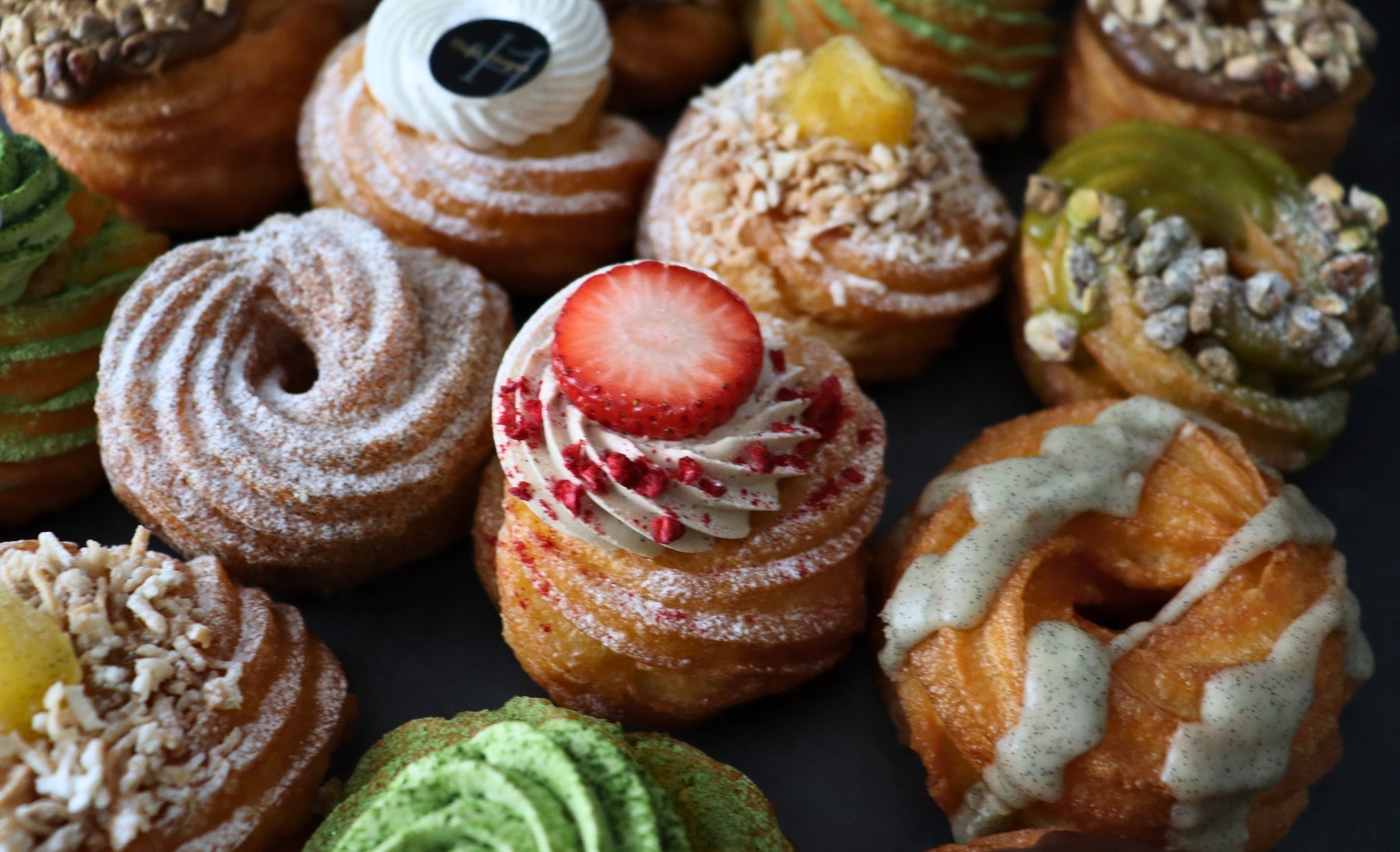 揚げたてならではのサクッと軽やかな食感と、芳醇なバニラの香りが広がるフレンチクルーラーに、パティシエが目の前でデコレーションを施します。シンプルなシュガーコーティング、バニラと抹茶の上品な組み合わせ、甘酸っぱいイチゴとバニラクリームのショートケーキ風アレンジなど、全9種類の個性豊かな味わいをご用意しました。