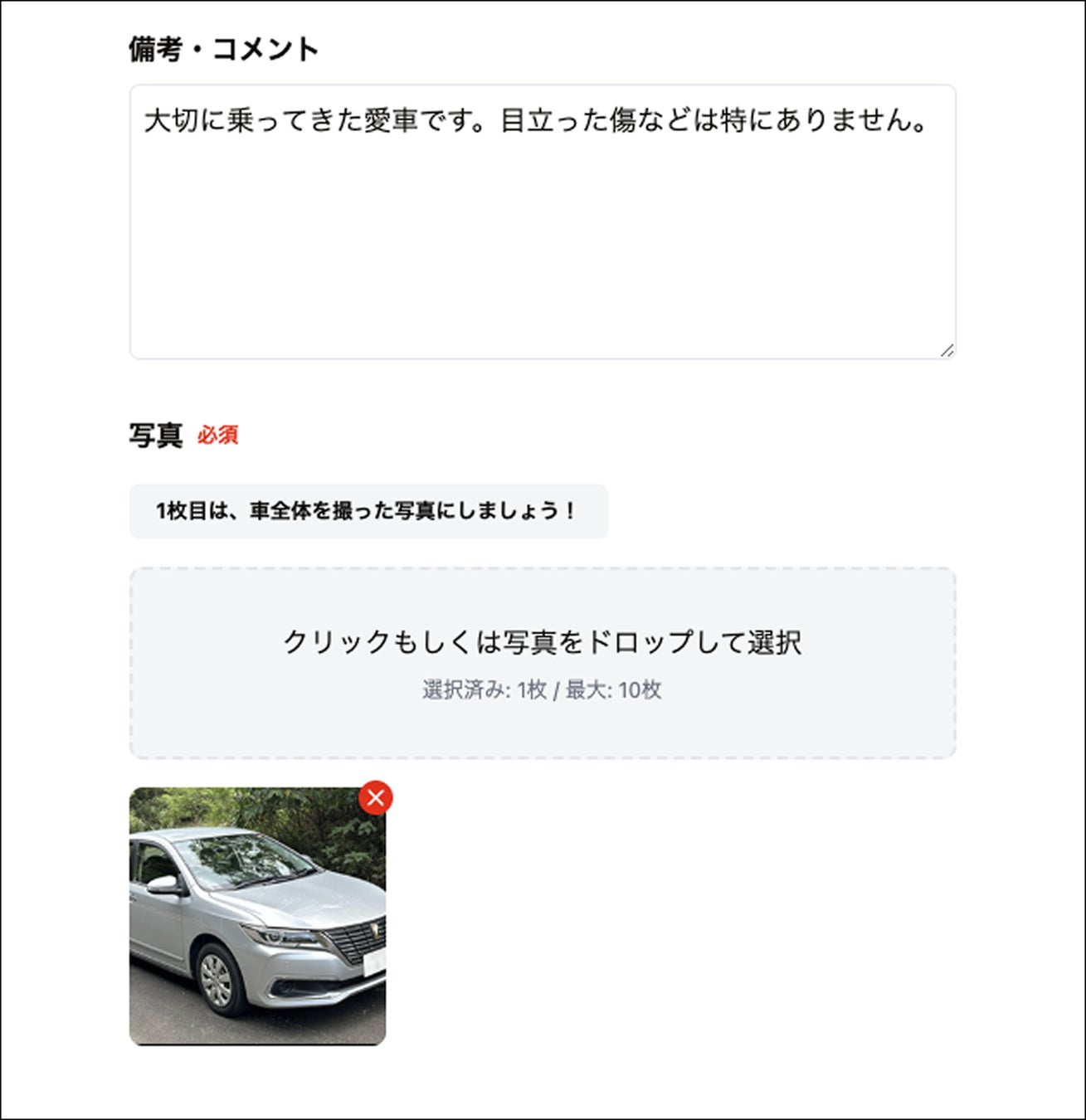 メーカー、車種や修復歴などを入力します。必要であれば「備考・コメント」により詳細な情報を記載します。最後に車の写真をアップロードします。